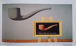 „Ceci n’est pas une pipe“ – „Dies ist keine Pfeife” ist eines der bekanntesten Bilder von Magritte. Dieses berühmte Gemälde ist im Jahr 1929 entstanden. Was Magritte meint, ist dass man auf dem Bild eine Pfeife sieht, aber es ist keine tatsächliche Pfeife. Es ist nur eine abgebildete Pfeife. Er hat auch das Wort „Pfeife“ schreiben können und das hätte nichts an seinem Zitat geändert. Er spielt hier mit einer philosophische Einstellung.