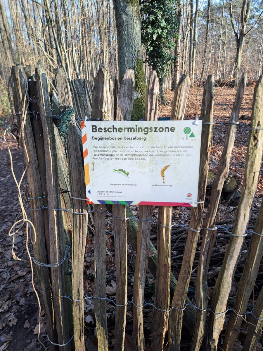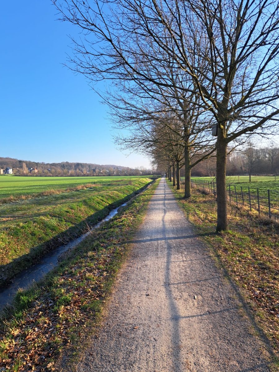 Wir verlassen das Gelände der ehemaligen Abtei in nördlicher Richtung und zweigen am Knotenpunkt 42 nach rechts auf einen schmalen Weg ab, der uns entlang eines kleinen Wasserlaufs durch eine Wiesenlandschaft zum Punkt 48 führt. Dort biegen wir nach links ab auf die von Wohnhäusern gesäumte Straße Negenbundespad, die kurz darauf in die Schoolbergenstraat einmündet. Wir laufen einige Minuten in östlicher Richtung, ehe es links in den schmalen Martellekensweg in waldigem Gelände bergauf in den „Kloosterbos“ geht.