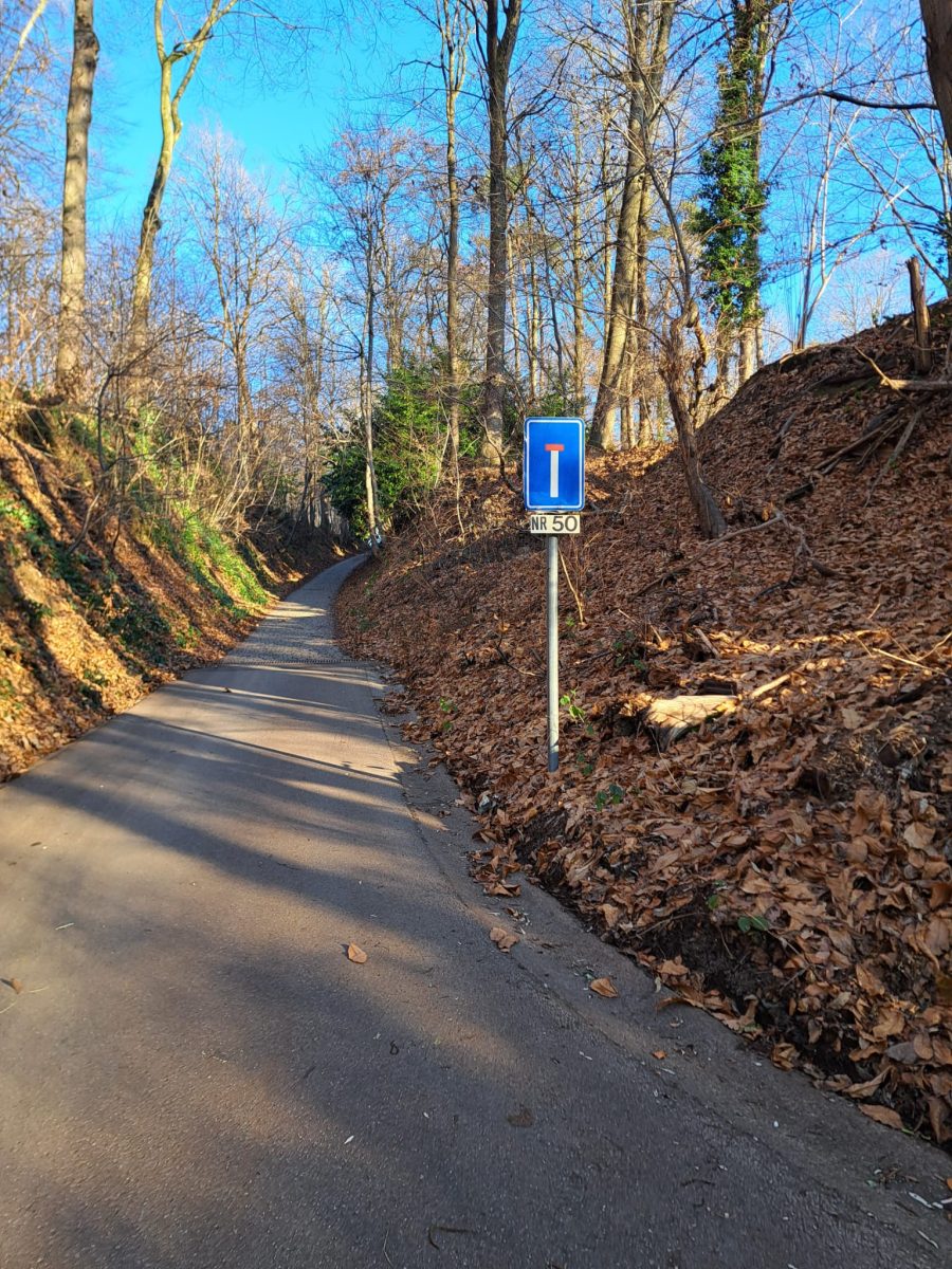 Am Punkt 45 geht es weiter rechts ab. Der Weg führt nun steil hinab in bebautes Gelände. Wir biegen nach rechts auf die Bergstraat und dann anschließend nach links auf die Liemingenstraat ab. Dann zweigen wir nach rechts auf die Straße Op de Vliet ab. Sie wird – im Gegensatz zu den vielen schmucken Villen, die wir zuvor gesichtet haben – von einfacheren Wohnhäusern gesäumt. Am Punkt 43 biegen wir nach links auf den Genadeweg ein, an der nächsten Ecke dann auf den Wilselesteenweg. Vorsicht bitte! Die Wegmarkierung lässt an dieser Stelle zu wünschen übrig.