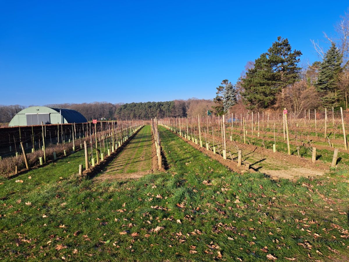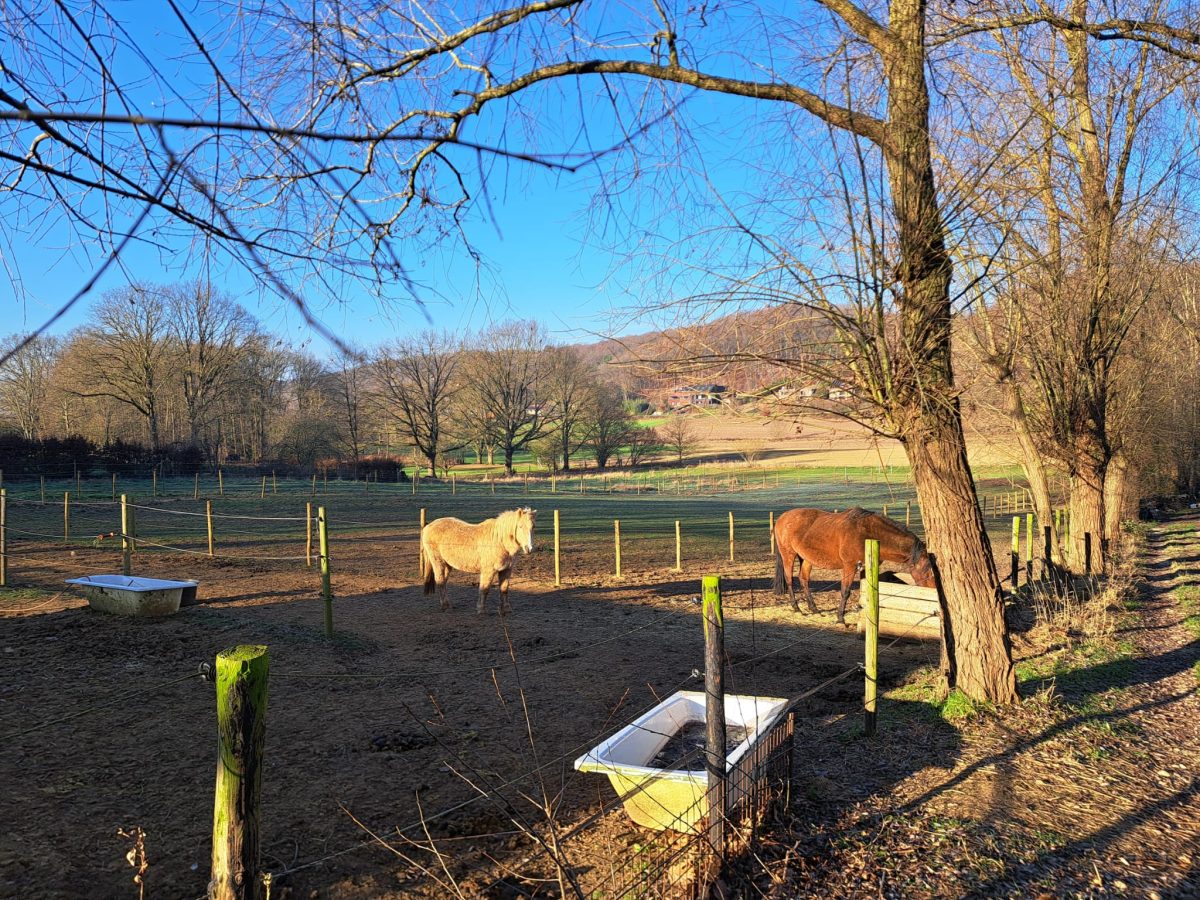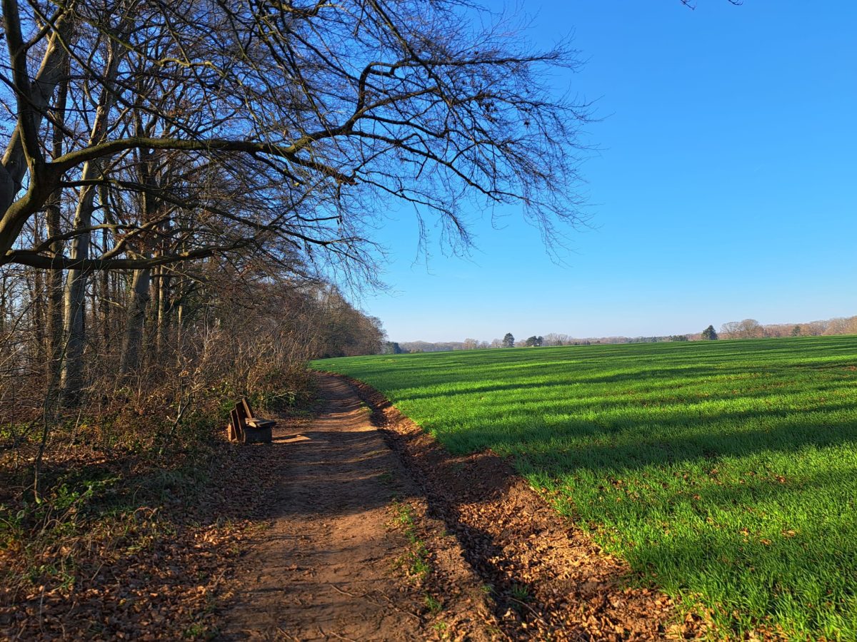 An einem großen, länglichen Wirtschaftsgebäude biegen wir nach links auf die Slangenstraat ab und kommen kurz darauf zu dem an der Grenze zur Nachbargemeinde Holsbeek gelegenen Punkt 19. Dort zweigen wir nach links in Richtung des Punkts 12 ab. Nun erreichen wir die Ausläufer des umfangreichen Mischwaldes Chartreuzenbos. Auf der Höhe kommen wir in freies Gelände und biegen auf einen asphaltierten Weg nach links ab. Rechterhand befindet sich das kleine, aber offenbar, dem Klimawandel sei Dank, expandierende „Wijndomein Chartreuzenberg“.