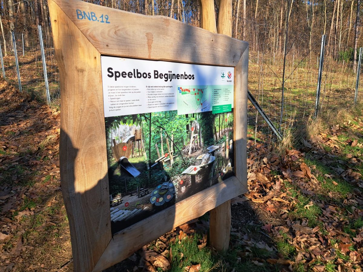 Wir bleiben zunächst auf dem Plateau und gelangen nach den kurz voneinander entfernten Punkten 12 und 13 zum – abermals – in waldigen Gelände gelegenen Punkt 101. Auch hier fällt auf, dass immer wieder recht schmucke Wohnhäuser gebaut werden durften. Auf der rechten Seite erahnt man bei Blick durch die Bäume hindurch ebenes Gelände. Der Weg führt weiter auf und ab, ehe wir am Punkt 44 wieder auf der Höhe nach links in Richtung des Punkts 45 abbiegen. Rechterhand befindet sich der Waldspielplatz „Speelbos Begijnenbos“.