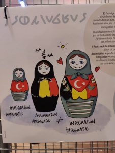 Am interessantesten ist vielleicht der Teil der Ausstellung, der in mehreren Schritten die Entwicklung Molenbeeks von einem Dorf zur heutigen Stadt nachzeichnet: 1810 – 1870 – 1910 – 1970 – 2014. Mit wenigen Bildern und kurzen Texten (FR/NL) wird deutlich, wie Molenbeek sich im Zuge der Industrialisierung räumlich verändert hat, wie der Lebensraum der Einwohner Schritt für Schritt reorganisiert wurde und aus dem ursprünglichen Dorf eine Stadt wurde. Besonders interessant ist dieser Teil der Ausstellung, wenn man die Arbeiten von Henri Lefebvre „Das Recht auf Stadt“ (1968) und David Harvey „Rebellische Städte“ (2013) im Hinterkopf hat und auf die gegenwärtige Weiterentwicklung der Reorganisation des Raumes infolge der Digitalisierung schaut. Man kann eine Vorstellung davon erhalten, was es für die Entwicklung der urbanen Räume bedeutet, dass die Digitalisierung die ökonomische Wertschöpfung mehr und mehr aus dem physischen Raum in den digitalen und virtuellen Raum (Clouds) verschiebt.