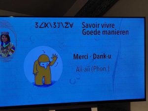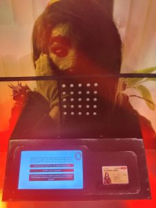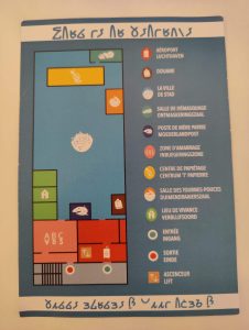 Der Autor dieser Zeilen hat sich für die Rolle eines Asylsuchenden entschieden. Mit Frau und Kindern ist er angekommen, so beschreibt es der Spielplan. Zunächst müssen sich die Neuankommenden beim Zoll melden. Das funktioniert so, dass man seine ID-Karte, die man an der Kasse im Empfangsbereich des Museums bekommen hat, auf ein Lesegerät legt. Dann wird auf einem kleinen Bildschirm mitgeteilt (je nach ID-Karte in FR oder NL), was man als nächstes zu tun hat.