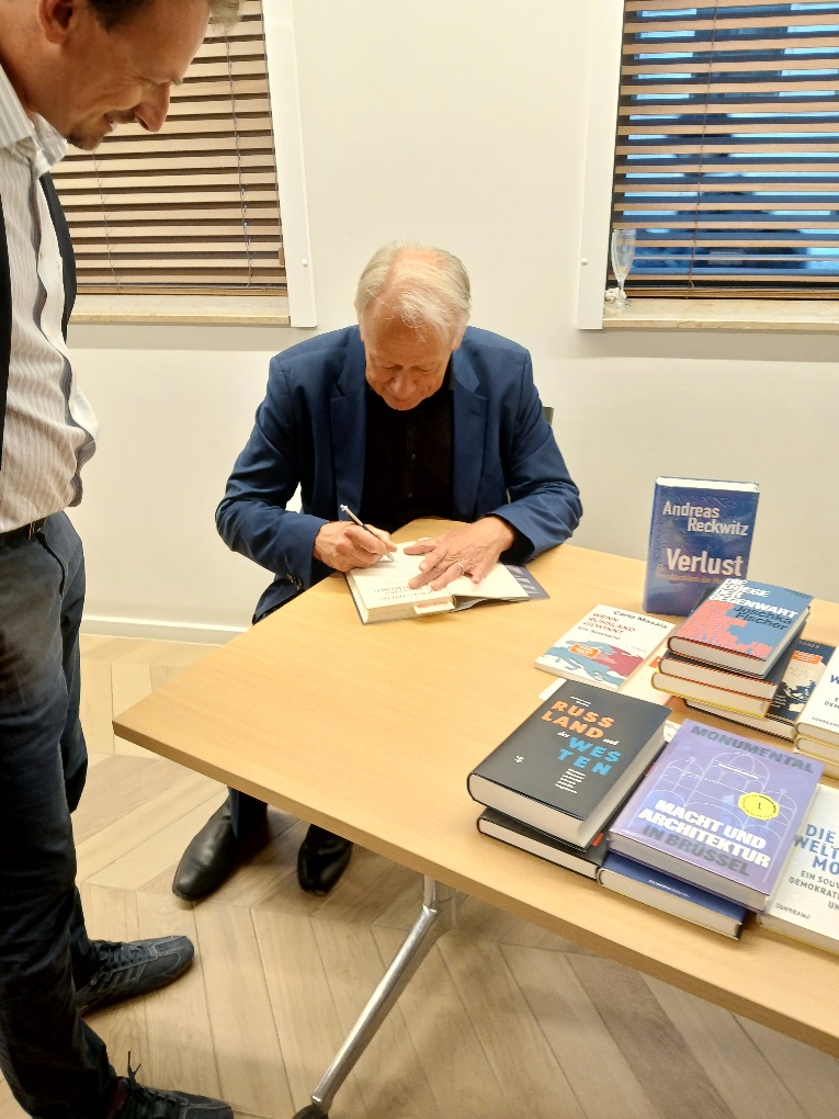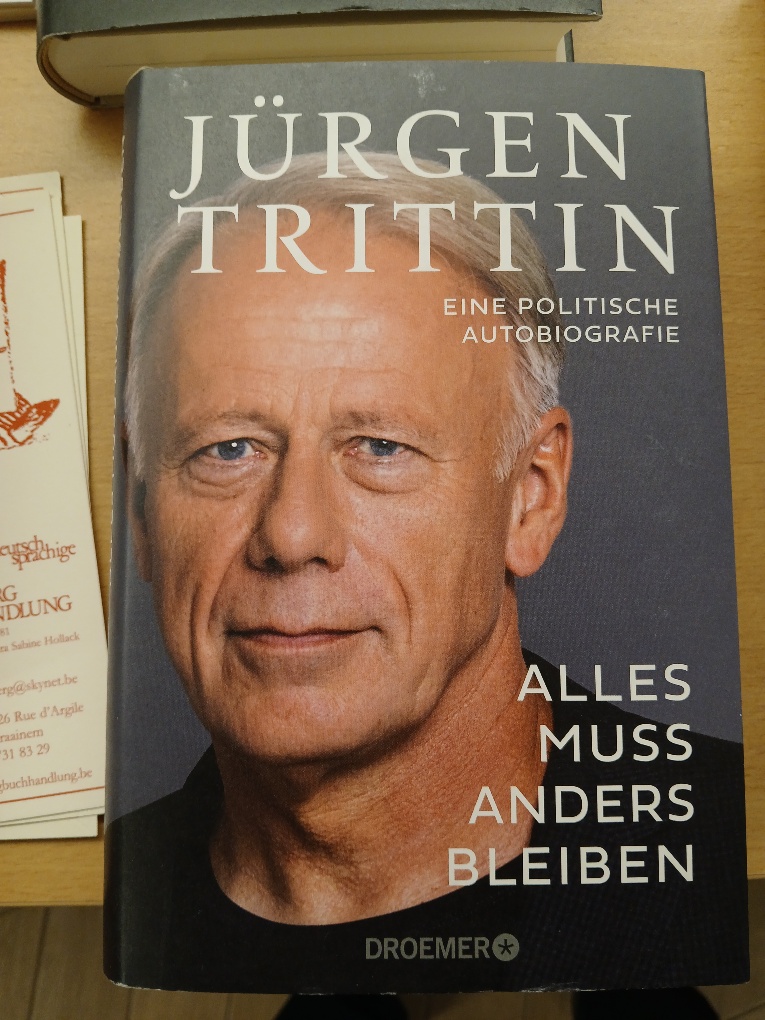 Der anschließende Empfang gab nicht nur Gelegenheit zu einem angeregten Austausch über dieses brandaktuelle Thema, sondern auch, sich von Jürgen Trittin am Büchertisch der Gutenberg-Buchhandlung seine Autobiographie „Alles muss anders bleiben“ signieren zu lassen.