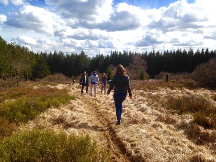 Am Freitag den 15. April nehmen wir den Bus bis zum Hohen Venn. Dort beginnen wir eine Wanderung von etwa sechs Kilometern durch die Natur. Wir haben Glück, die Sonne scheint. Die Landschaft und die Aussicht sind wunderschön. Wir gehen zum höchsten Punkt Belgiens, der nämlich 694 Meter hoch liegt. Wir gehen sogar eine Treppe hinauf, um an Höhe zu gewinnen und so 700 Meter hoch zu sein.