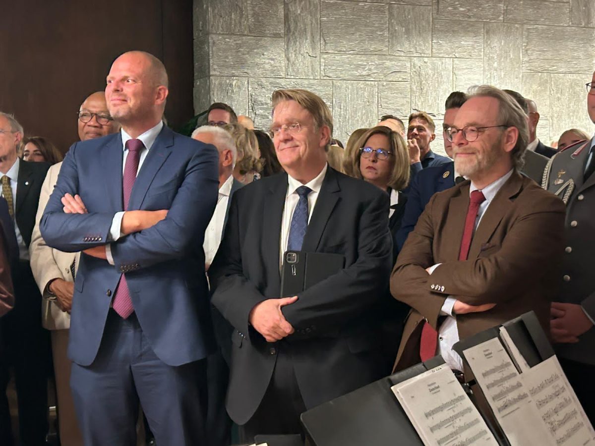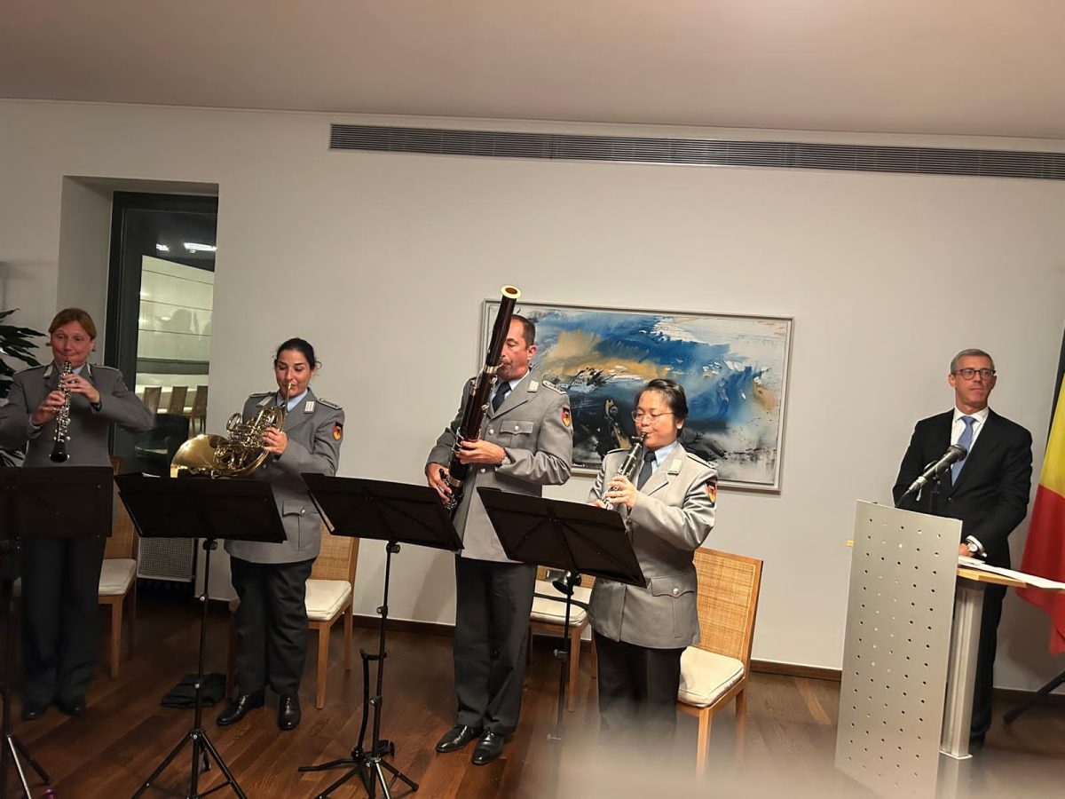Ein weiteres Thema der Ansprache des deutschen Botschafters war der zunehmende Antisemitismus in Europa, in Deutschland und auch in Belgien. Seit dem 7. Oktober 2023 komme es zu Vorfällen, denen alle gemeinsam begegnen müssten. Israel habe das Recht, sich im Gaza-Konflikt gegen die Hamas-Organisation zu verteidigen; es müsse aber alles dafür tun, um die Zivilbevölkerung zu schützen. Zu den weiteren Themen, die Kotthaus ansprach, die er abwechselnd in den drei belgischen Landessprachen sowie Englisch hielt, zählten die exzellenten Beziehungen zwischen Deutschland und Belgien. Der Botschafter erwähnte die intensive Zusammenarbeit in der Energieversorgung, die Entwicklung gemeinsamer Wasserstoff-Projekte, die Bedeutung von Gaslieferungen nach Deutschland sowie den Bau von Windkraftanlagen in der Nordsee, wo Deutsche und Belgier eng zusammen arbeiteten. Insgesamt schaute Kotthaus optimistisch in die Zukunft und meinte abschließend, dass es ihm eine große Freude sei, Deutschlands Botschafter in Belgien zu sein. Nach einer Vorstellung der Vorzüge Baden-Württembergs sowie gemeinsamer Projekte mit Belgien durch den Leiter der Landesvertretung, Bodo Lehmann, erklangen die deutsche, belgische und europäische Hymne, intoniert durch das Holzbläserquartett des Musikkorps der Bundeswehr.