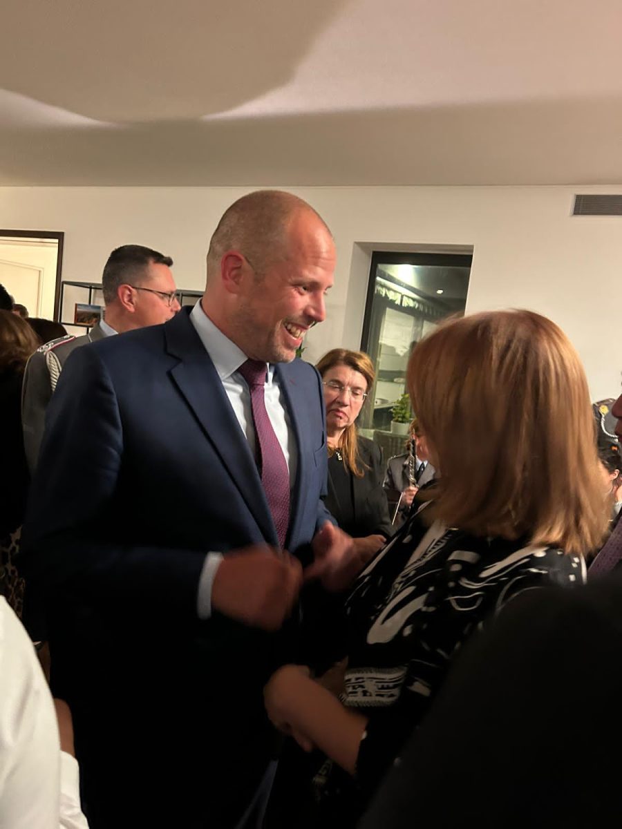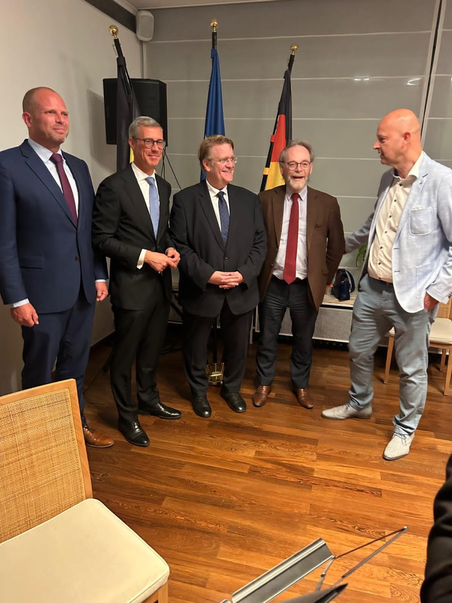 „Ich heiße Sie alle in der deutschen Residenz willkommen. Das Jahr 2025 ist voll von Jubiläen und Feierlichkeiten”, so Kotthaus, der über die deutsche Wiedervereinigung Deutschlands im Jahr 1990 sprach, die nun zum 35. Mal gefeiert wurde. „Ein kleines Wunder geschah“, fuhr er fort, bezugnehmend auf den Fall der Berliner Mauer im Jahr 1989. Die Grenzöffnung war auf monatelange Proteste der Bürgerinnen und Bürger der damaligen DDR gefolgt. Und dieser Mauerfall ebnete den Weg für die deutsche Einheit ein knappes Jahr später. Dankbar sei er, dass Deutschland von guten Freunden umgeben sei, denn durch ihre Hilfe sei der Wandel vollzogen worden. In diesem Zusammenhang betonte Kotthaus, wie wichtig es sei, Mitglied der Europäischen Union und der Nato zu sein.