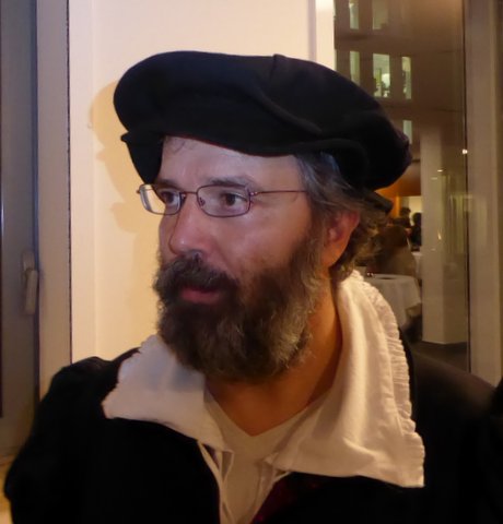 Roland Wolf vom Kultur- und Stadthistorischen Museum Duisburg trat mit nachgeschneidertem Barett und Gewand des historischen Gerhard Mercator auf und gab auch Autogramme. Prof. Jan de Graeve von der Internationalen Föderation der Geometer und Thilo Elstner von der Sternwarte Bochum waren Ko-Referenten. Muderator war der ausgewiesene Kartenkenner Wulf Bodenstein (BDG).