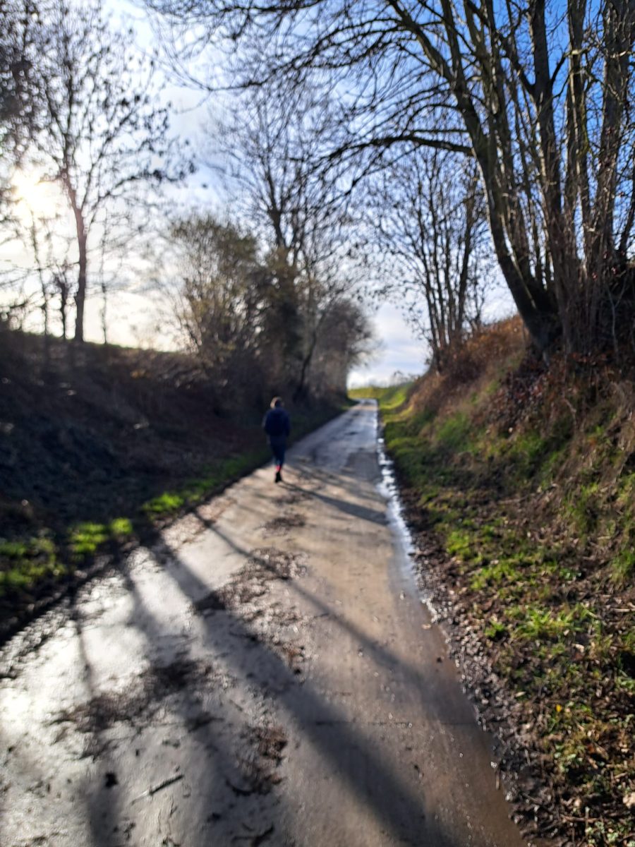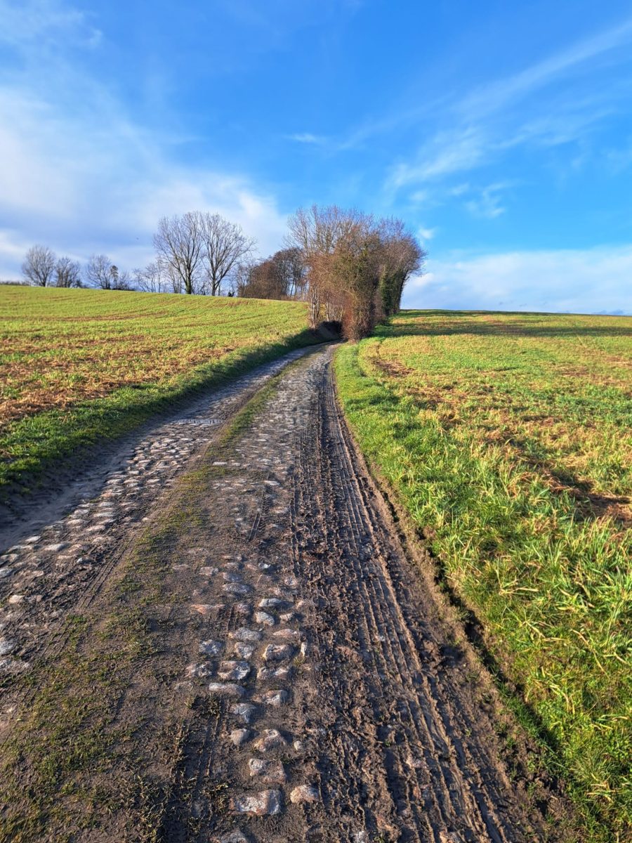Nach einigen hundert Metern auf der Walestraat verlassen wir den Ort und gelangen auf – offiziell – meist befestigten Wegen in die weitgehend unberührte Natur. Neben Wanderern und Radfahrern sind die menschlichen Lebewesen, die sich hier tummeln, offenbar Landwirte, die mit schweren Nutzfahrzeugen dafür gesorgt haben, dass Kopfsteinpflaster und Betonflächen weitgehend mit einer matschigen Schicht bedeckt sein können. Glücklicherweise sind an den Rändern Trampelpfade entstanden, die es erlauben, einigermaßen trockenen Fußes voranzukommen.