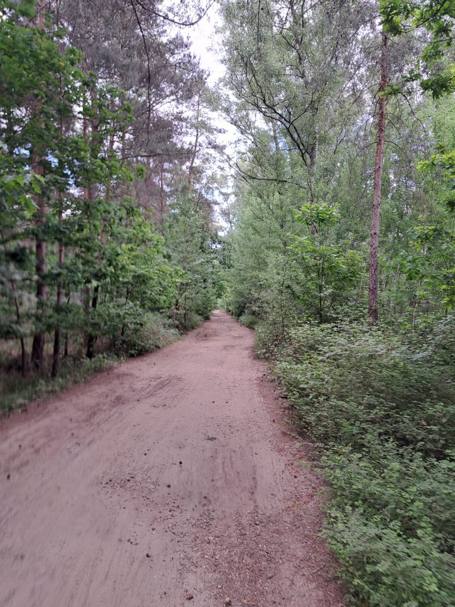 Wir laufen jedoch zum 600 Meter entfernten Punkt 11 weiter. Zunächst geht es etwas hinunter. Linkerhand befindet sich ein Friedhof. Hinter dem Bahnübergang biegen wir nach links ab und laufen ein kurzes Stück an der Hauptstraße Lichaartseweg entlang, ehe wir nach rechts auf eine schmale Straße abbiegen und nach kurzer Zeit wieder im Wald sind. Am Punkt 11 zweigen wir rechts ab und gehen in Richtung des gut einen Kilometer entfernten Punkts 15 weiter. Auf einer Anhöhe passieren wir zunächst eine Kapelle aus rotem Ziegelstein und überqueren anschließend weiter unten abermals die Hauptstraße.