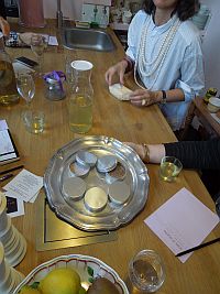 Heute also ein Kurs für Fortgeschrittene, es geht um „accords floraux“, das Geheimnis von Duft und Geschmack blumig-leichter Pflanzenaromen. Bei einer Tasse Jasmintee und rosafarbenen Butterkeksen, die mit der exotischen Parfumnote „vétiver“ bekannt machen, berichten Teilnehmerinnen, wie sie den bisherigen Lernstoff daheim umgesetzt haben. Veronique erzählt diese Geschichte: Aus gesundheitlichen Gründen muss ihr Hund ständig gekochte Zucchini essen. Er hat darauf natürlich gar keinen Appetit mehr. Also entschließt sie sich, eine Prise einer Aromapfeffermischung, die sie bei Michèle kennengelernt und erworben hatte, dem Gemüse beizufügen. Als erstes kommt der Hund in die Küche und schnuppert aufgeregt, dann verzehrt er das ungeliebte Gemüse mit offensichtlichem Genuss. Als später Mann und Kinder nach Hause kommen, fragen sie als erstes nach dem wunderbaren Duft, der das Haus durchzieht. Applaus für Veronique, das motiviert natürlich, sich auf das heutige Programm einzulassen.