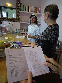 Michèle verteilt einen Flyer, in dem sie die blumigen Düfte ihrer Aromathèque auflistet und der Platz für Notizen bietet sowie eine Liste von Pflanzen, die entweder als „schwarz-fruchtig“ (viele Beerenfrüchte, aber auch Salbei und Rosmarin) oder als „leicht-süßlich-fruchtig“ einzuordnen sind (etwa Aprikose, Banane, Mango). Was genau das bedeutet, dürfen wir nach einer kurzen theoretischen Einführung in die Geheimnisse der Parfümerie und die Physiologie des Geschmacks erschnuppern und erraten. Beim Lieblingsduft gibt es erstaunlich viel Übereinstimmung, fast allen gefällt Geranienduft am besten, während ein als grünliches Öl daherkommender Duft der tropischen Pflanze Davana alle erstmal irritiert zurückzucken lässt.
