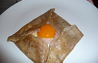 In die heiße Pfanne einen Buchweizenpfannkuchen mit der schönsten Seite nach unten legen, ein Ei aufschlagen und auf die Mitte des Pfannkuchens geben. Das Eiweiß vorsichtig verstreichen, damit es schneller weiß wird und dabei achten, dass das Eigelb in der Mitte bleibt. Frisch gemahlenen Pfeffer drüber streuen. Eine Handvoll Käse, sowie etwa eine halbe Scheibe Schinken klein schneiden und um das Eigelb verstreuen. Warten, bis der Käse anfängt zu schmelzen, dann zwei gegenüberliegende Seiten zur Mitte hin falten, dabei soll das Eigelb sichtbar bleiben, die beiden anderen Seiten ebenfalls falten. Darauf achten, dass das Feuer nicht allzu hoch gestellt ist, damit der Pfannkuchen während dessen nicht anbrennt. Im vorgeheizten Backofen warm stellen und die anderen galettes complètes zubereiten.