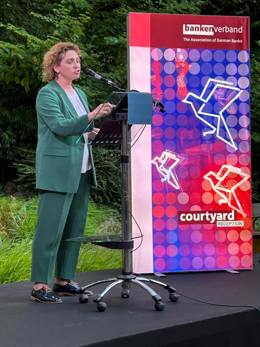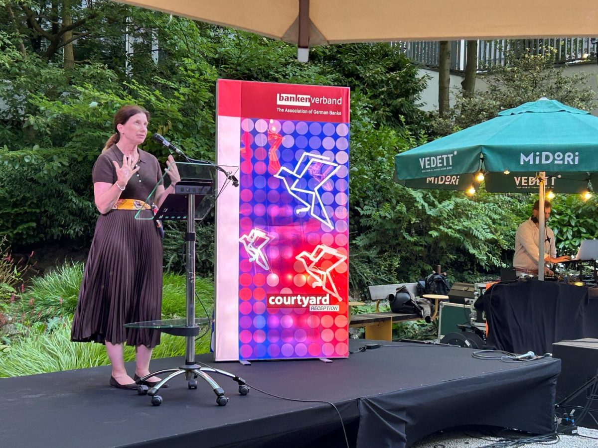 Nachdem die Vorstandsvorsitzende der Commerzbank, Bettina Orlopp, die Herausforderungen für den europäischen Finanzmarkt skizziert hatte, wartete EIB-Vizepräsidentin Beer mit Optimismus und positiven Botschaften für die Banken- und Finanzdienstleistungsbranche auf: