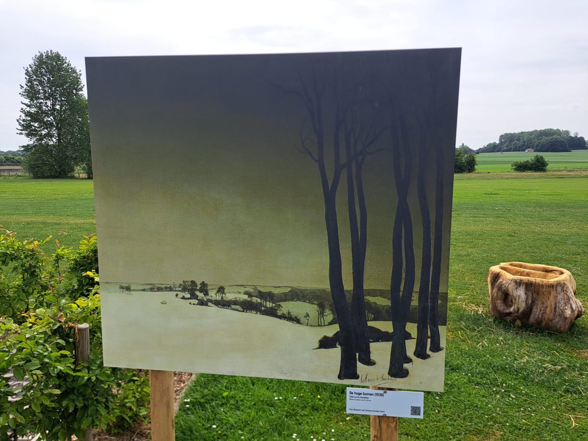 Nach dem Passieren einer einspurigen Bahnstrecke entdecken wir auf der rechten Seite die erste der aufgestellten neun Reproduktionen von Gemälden. Den Anfang macht das von Leo Piron – nach der Hochzeit mit einer Tochter von De Saedeleer dessen Schwiegersohn – gemalte und in Privatbesitz befindliche Landschaftsbild mit der Bezeichnung „Die Flämischen Ardennen zur Erntezeit“, das harmonisch in die Umgebung eingepasst wirkt.