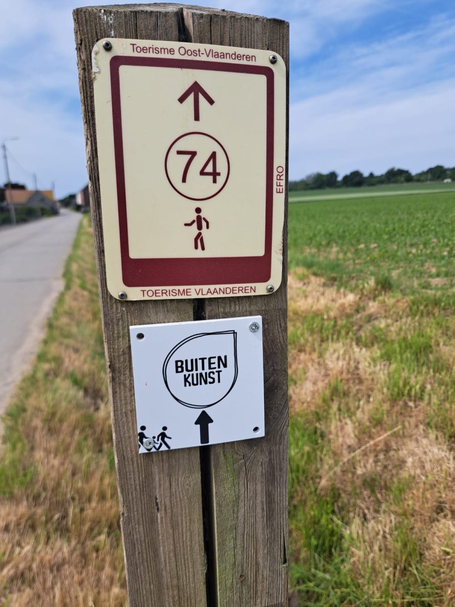 Wir haben uns dadurch nicht entmutigen lassen, sondern uns einfach auf den Weg gemacht. Unserem Instinkt folgend, haben wir den Parkplatz verlassen und die Maalzaakstraat in südwestlicher Richtung (nach links) gewählt – in unserem Fall keine falsche Entscheidung. Denn kurz hinter dem Zentrum entdeckten wir rechterhand ein – leider ziemlich klein geratenes – weißes Schild mit der Aufschrift, in zwei Worten, „Buiten Kunst“. Der Weg ist dennoch insgesamt gut ausgezeichnet. Die ersten paar hundert Meter auf Betonuntergrund, auch nach der ersten Abzweigung nach links, muten wenig spektakulär an.