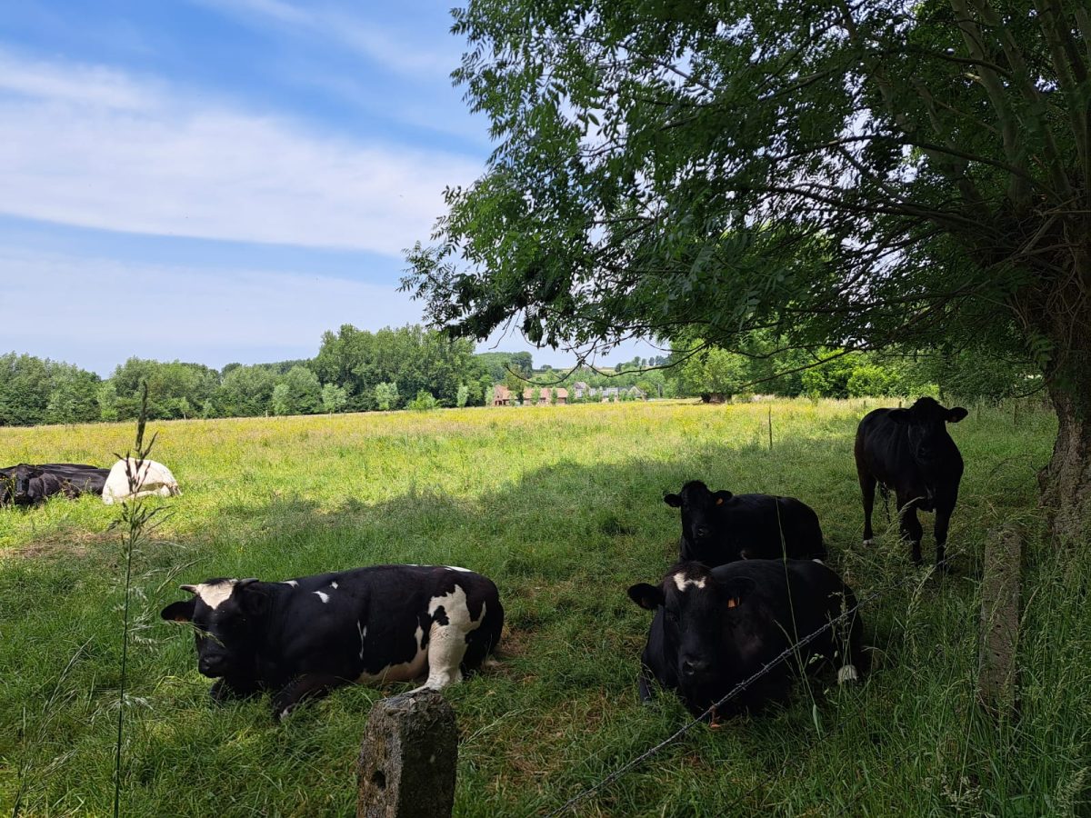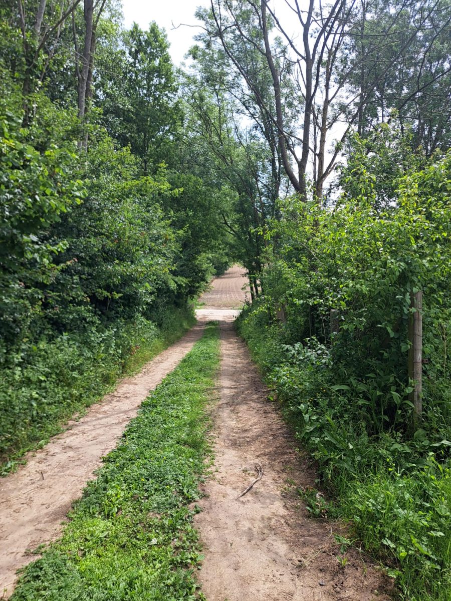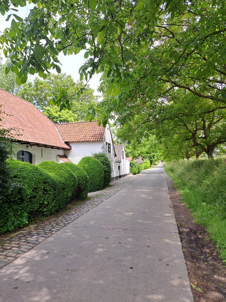 Auf einem schmalen Weg, gesäumt von alten Laubbäumen und Wiesen mit grasenden Rindern, gewinnen wir an Höhe, bis wir auf der Höhe an einem Backsteinbau nach links auf eine – betonierte – Straße abzweigen. Rechts erkennen wir in der Ferne eine nach ihrer Zerstörung im vergangenen Jahrhundert wieder aufgebaute Getreidemühle. Wir erblicken etwas später, an einem Rechtsknick, linkerhand ein recht stattliches Anwesen und gehen anschließend auf einem von wenigen Wohnhäusern und vielen Bäumen am Rand geprägten Weg weiter.