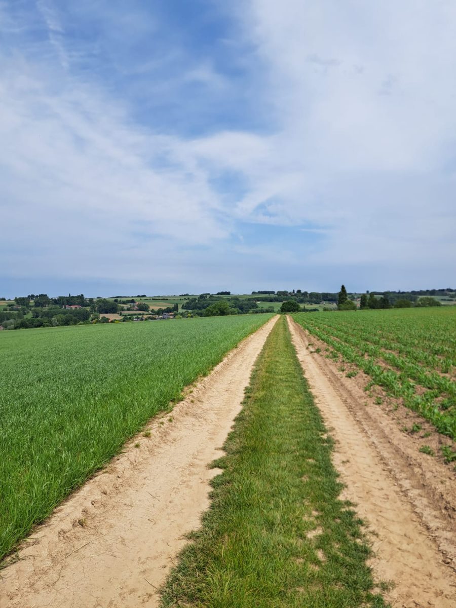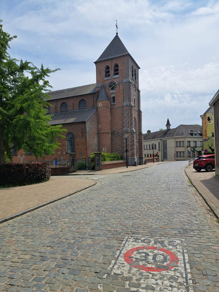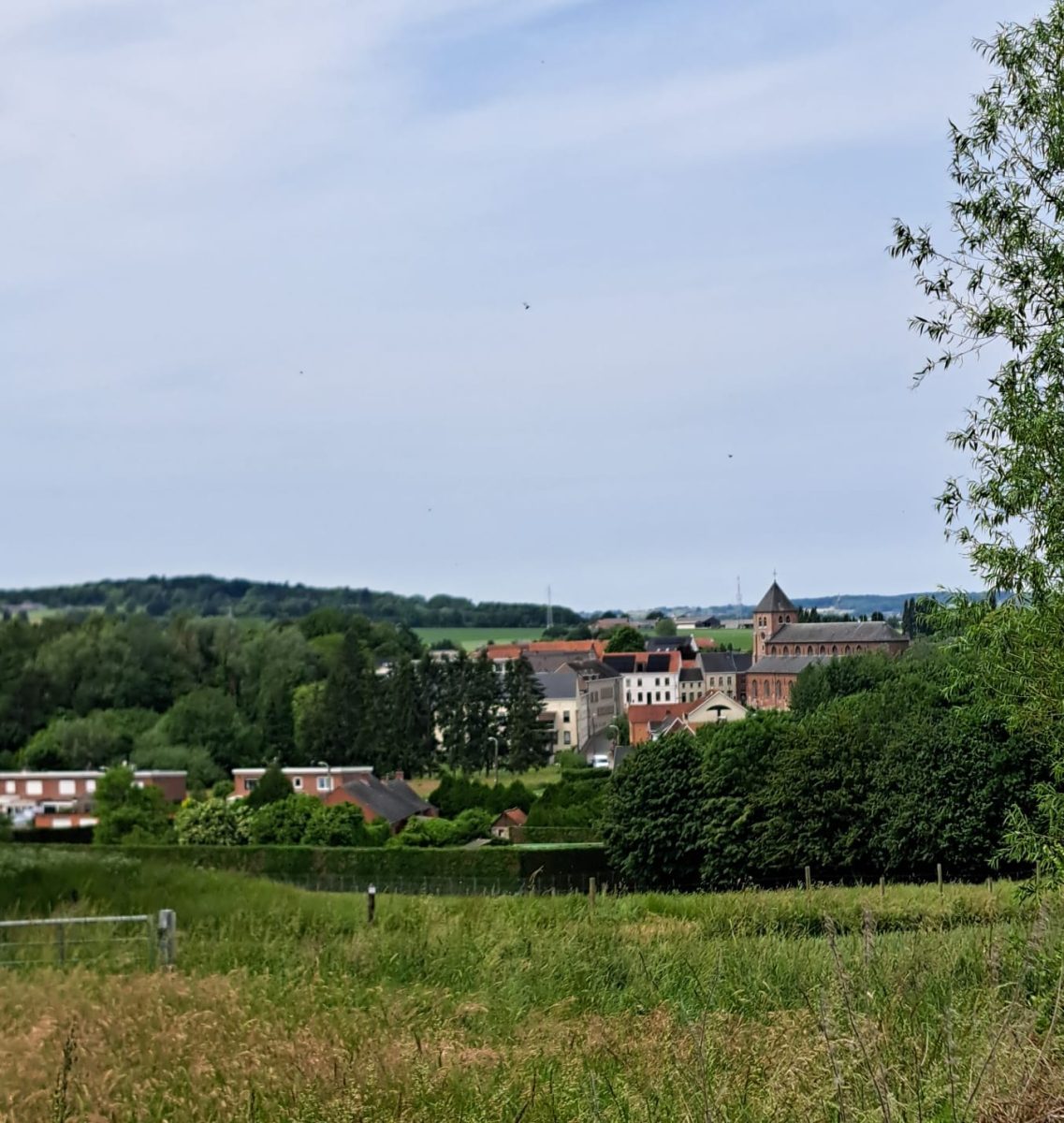 Kurz darauf verlassen wir die Straße und laufen ein längeres Stück auf unbefestigtem Untergrund weiter – zunächst auf einem klassischen Feldweg, später dann, stetig bergab, auf einem schmaleren, links von Waldstücken gesäumten Pfad. Nachdem wir zunächst rechterhand in der Ferne eine etwas größere Siedlung sehen können, richten wir etwas später den Blick nach links auf die große, noch romanische Bauelemente aus dem 12. Jahrhundert aufweisende, aber insgesamt neoklassisch geprägte Sankt Brixius-Kirche im Zentrum von Etikhove.