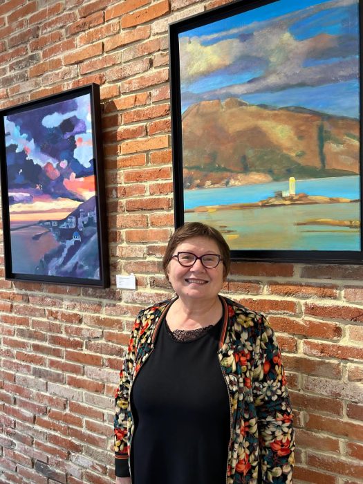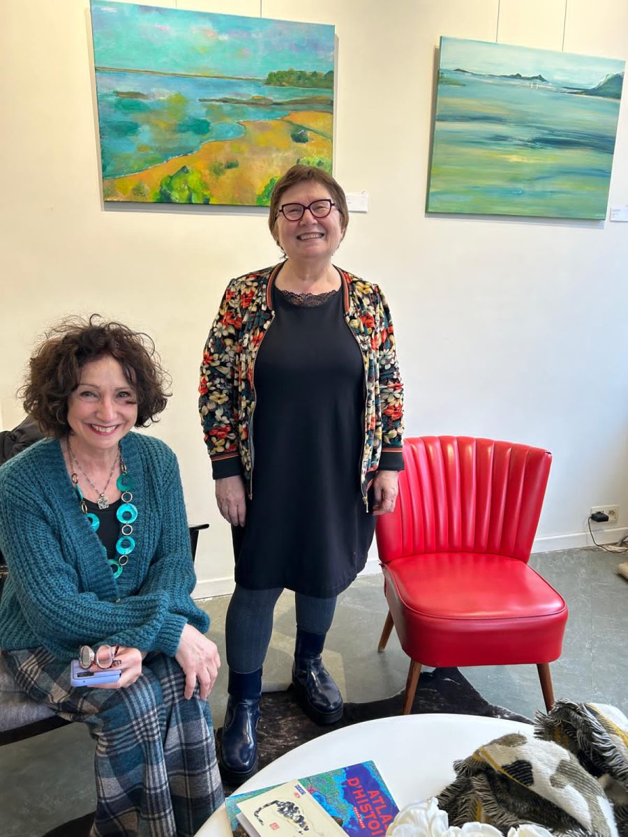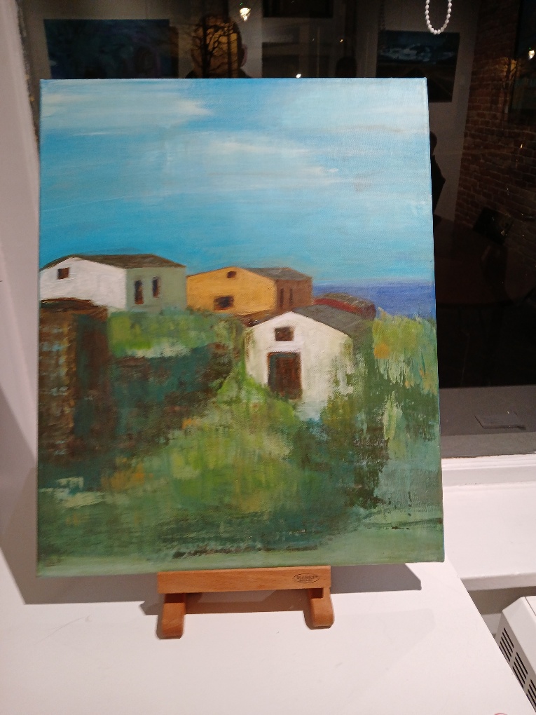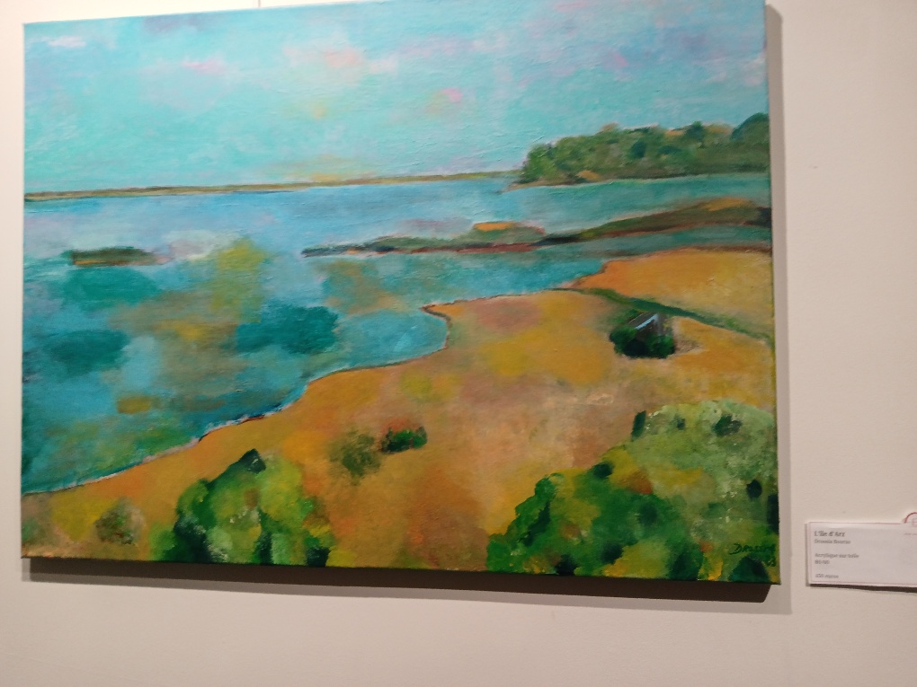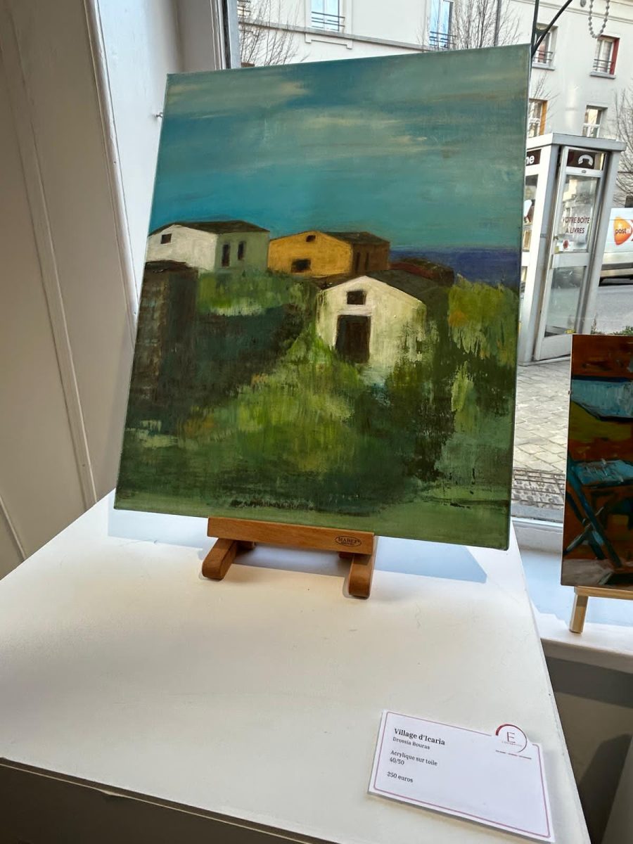 Gleich mehrere Leinwand-Gemälde aus der Bretagne finden sich auf der gegenüberliegenden Wand. „Ich liebe die Bretagne und fahre jedes Jahr hin“, sagt die dynamische Griechi. Sie schwärmt für das Nordmeer und die changierenden Lichtverhältnisse des Ärmelkanals. Am liebsten arbeitet sie im Freien nicht nur in mediterraner Wärme, sondern auch im maritimen moderaten Klimabreiten Belgiens und Frankreichs.