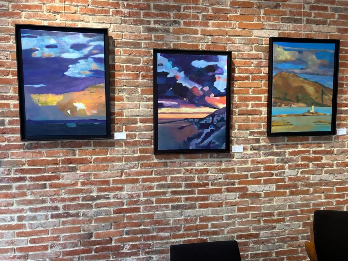 In der aktuellen Werkschau findet sich unter den gut 30 figurativen und auch expressionistischen Arbeiten oft als verbindendes Element das Meeresblau. Nicht nur mit Tiefblau auf der griechischen Insel Kreta. Gleich daneben auf der Ziegelsteinwand in der Galerie präsentiert sich zur Linken eine Sonnenuntergang-Stimmung von Ostende, und zur Rechten wird das sublime Nordlicht Schottlands eingefangen.