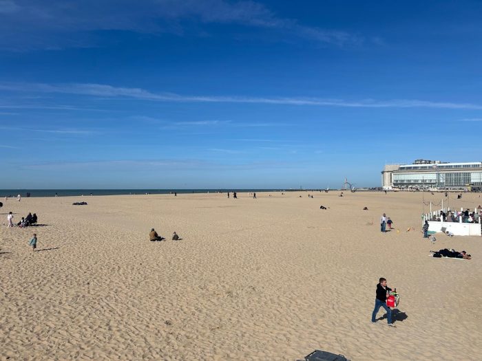 Vorbei am Casino wird endlich der Blick frei auf das blaue Band der Nordsee. An diesem Ostermontag zeigt sich „la mer du nord“ in einer selten erlebten Sanftheit windstill und kaum mit Wellenschlag trotz ansteigender Flut. Auf der Uferpromenade sitzen mehr Gäste auf den sonnigen Außenterrassen als innen in den Restaurants. Ein mediterran anmutendes Ambiente mit haushohen Palmen und einem DJ unter gelbweißem Sonnenschirm auf der dem Meer zugewandten Casino-Gebäude lockt Hunderte von Einheimichen und Touristen aus aller Welt zum Flanieren ein.