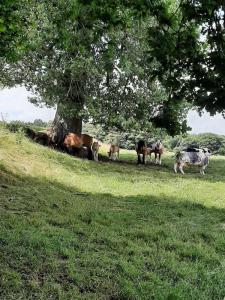 Auf einem breitem Weg geht es anschließend in nordöstlicher Richtung zum Punkt 313. Dort nehmen wir nicht den direkt bergab nach Huldenberg führenden Hohlweg, sondern zweigen nach rechts zum Punkt 261 ab. Auf der linken Seite, jenseits der gerne von Kühen und Pferden der einheimischen Rasse Belgisch Kaltblut bevölkerten Weide, eröffnet sich ein Panoramablick auf Huldenberg und seine Kirche.