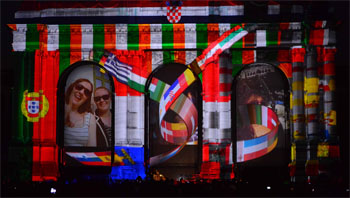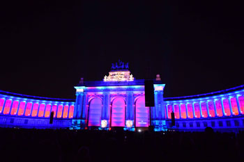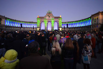 Geladen hatte am Donnerstag die Ständige Vertretung Deutschlands zu einer spektakulären Lichtinszenierung unter dem Titel „Sound and Lights of Unity“, die auf den Triumphbogen in Park Cinquantenaire und seine Flügelbauten projiziert wurde und sie in ein sich permanent wandelndes Farbenkleid hüllte. Dazu gehörte eine stündlich wiederholte achtminütige Videoprojektion, die die Überwindung der Teilung Deutschlands und Europas nach dem kalten Krieg sowie aktuelle europapolitische Herausforderungen künstlerisch thematisierte. Dazwischen sorgten der Berliner Lichtkünstler Matthias Zeckert und sein Team von „German Arts“ von 19 Uhr bis 24 Uhr für ein Sound & Light-Spektakel. Zu permanent neuen Lichtstimmungen legten die DJs Rainer Kranich (Ibiza), Chris Zippel (Berlin), Rich Ears (Amsterdam), Aiora (Athen) und ED2000 (London) speziell für diesen Abend kompilierte Chill out- und Ambient-Musik auf.