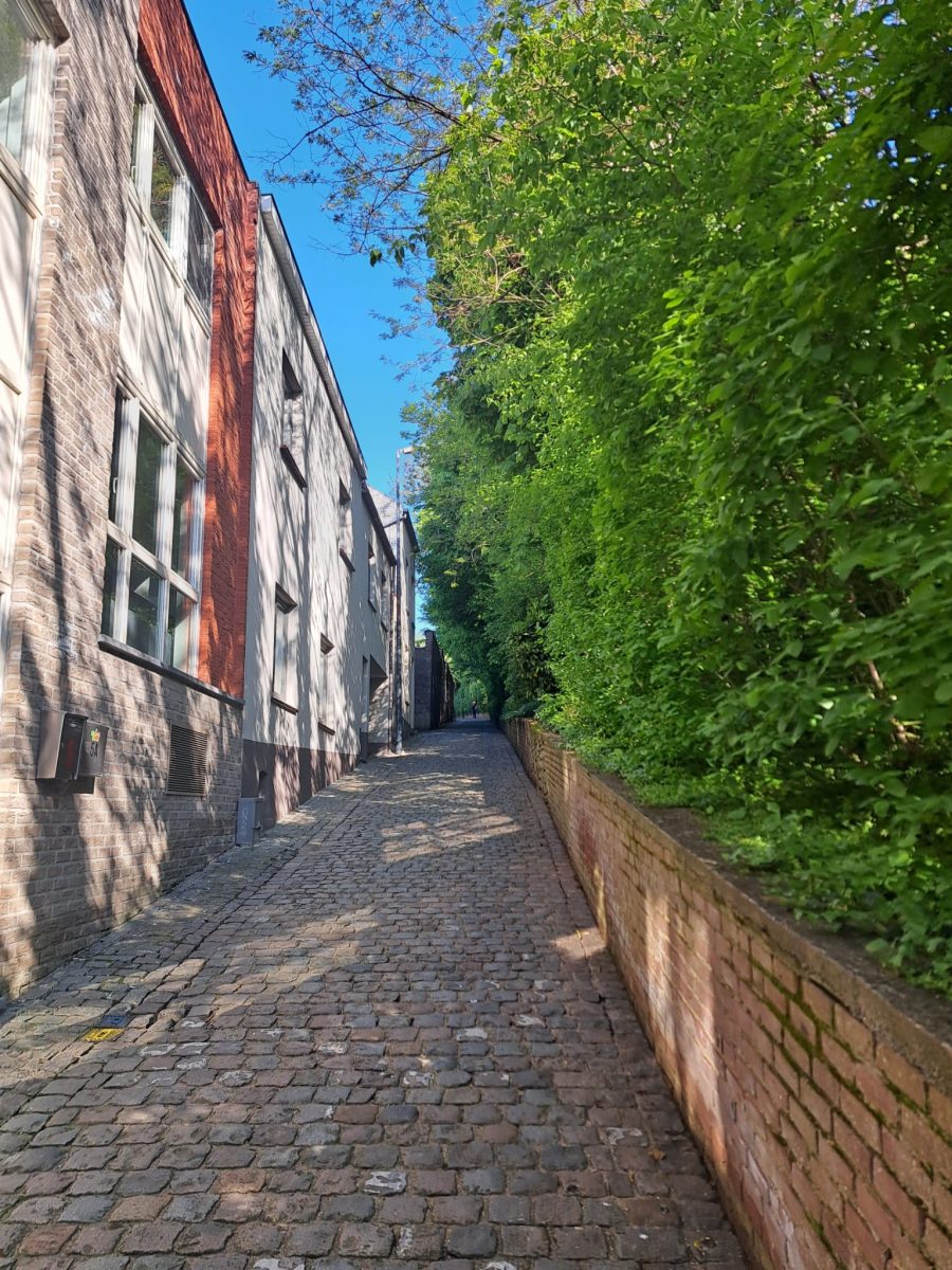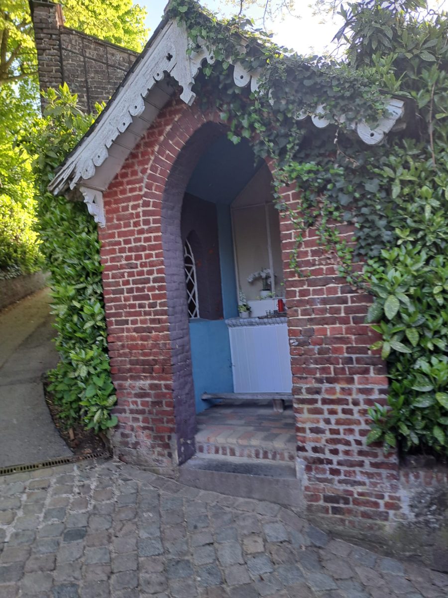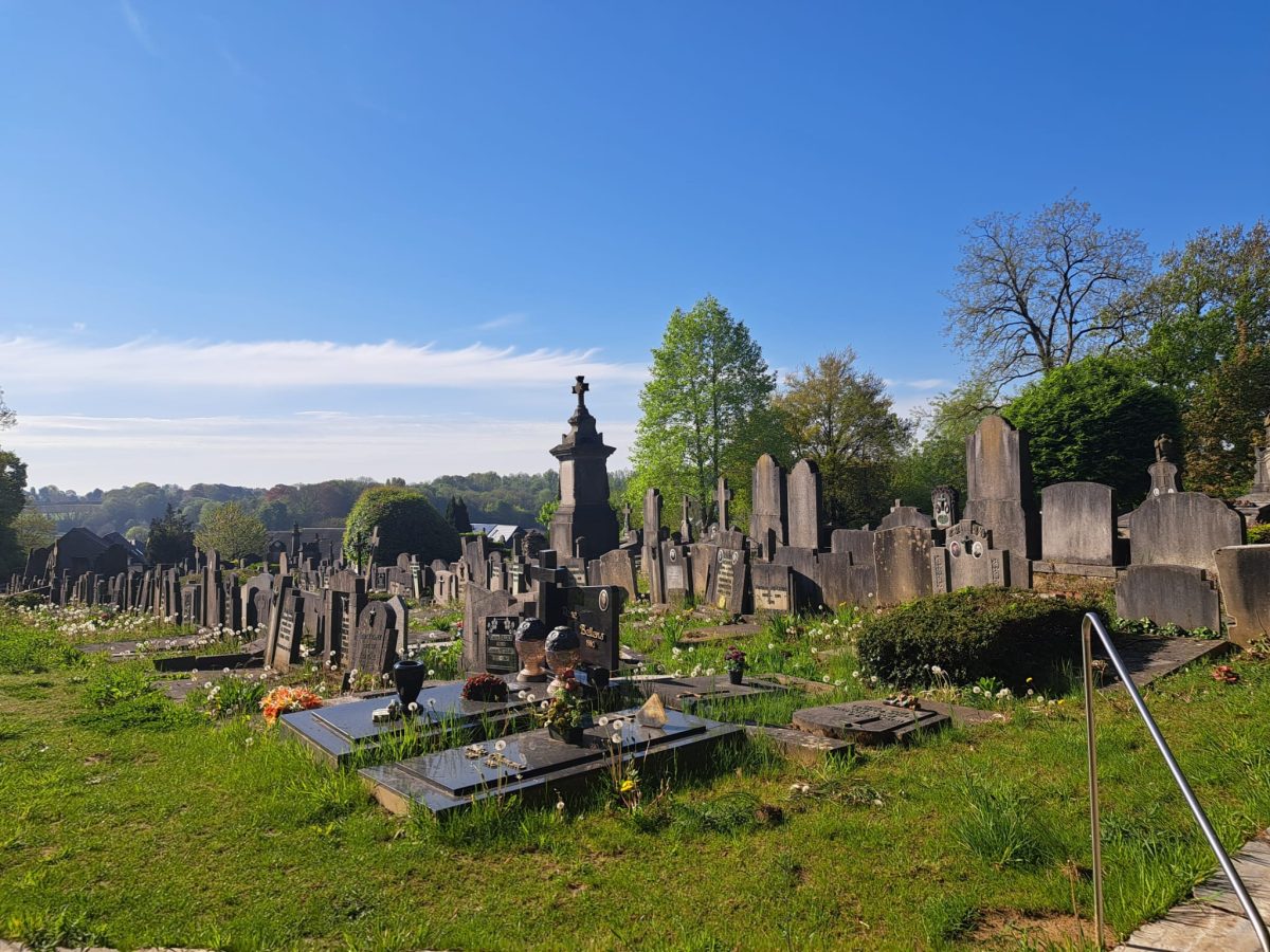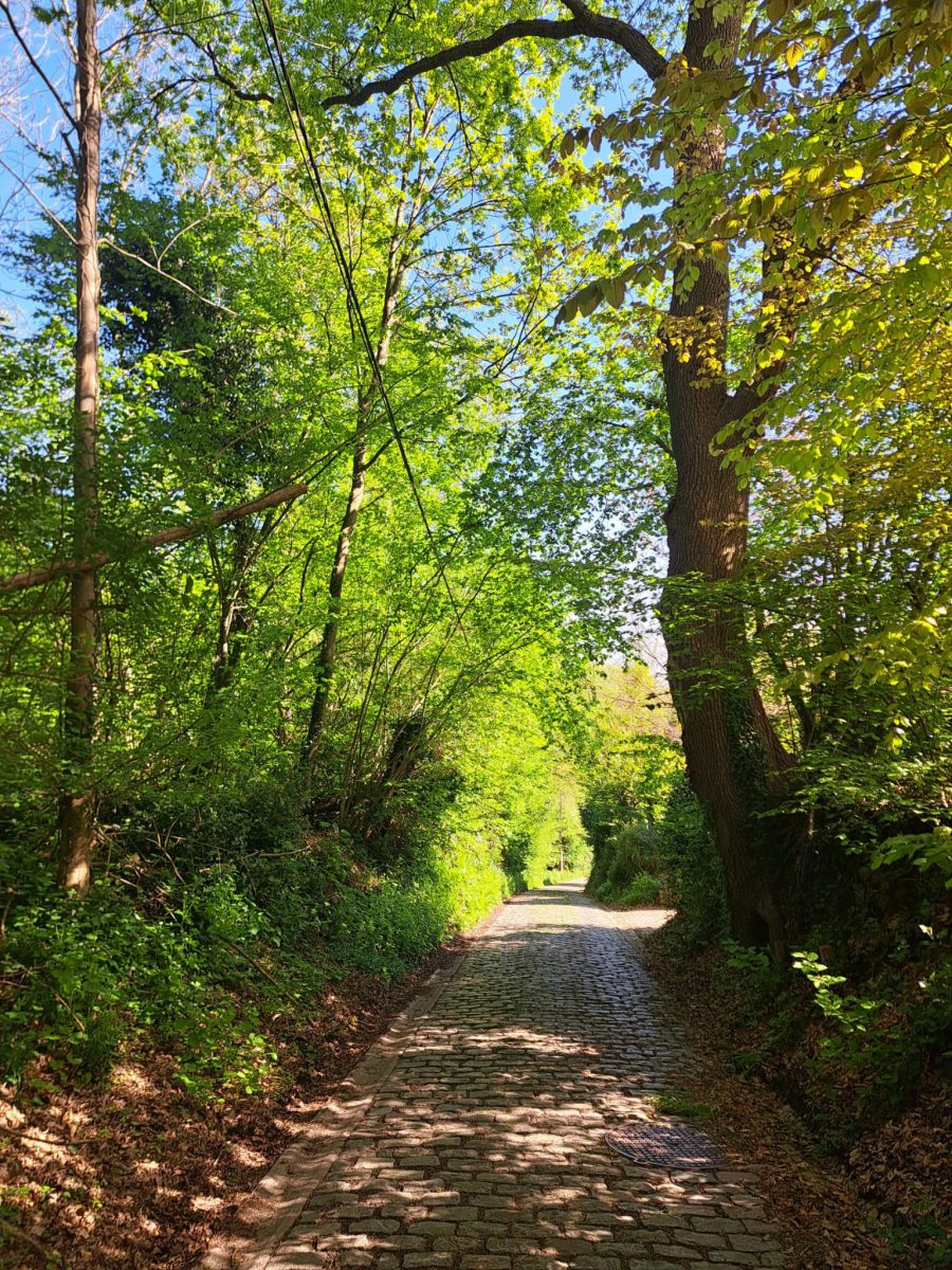Am oberen Ende des Platzes folgen wir ein paar Schritte der Hauptstraße nach links und überqueren sie, um auf der Höhe eines chinesischen „Take-away“-Lokals nach rechts in den Kopfsteinpflasterweg Solheide abzuzweigen und weiter bergauf zu gehen. An der nächsten Ecke, an der sich eine kleine Backsteinkapelle befindet, können wir nach rechts in die Gasse Mollenberg abbiegen. So können wir uns einen Bogen sparen, der durch ein kleines Neubauviertel führt. Man kann aber zunächst noch ein paar Schritte weiter zum linkerhand gelegenen alten Friedhof laufen und den Blick über Overijse schweifen lassen.