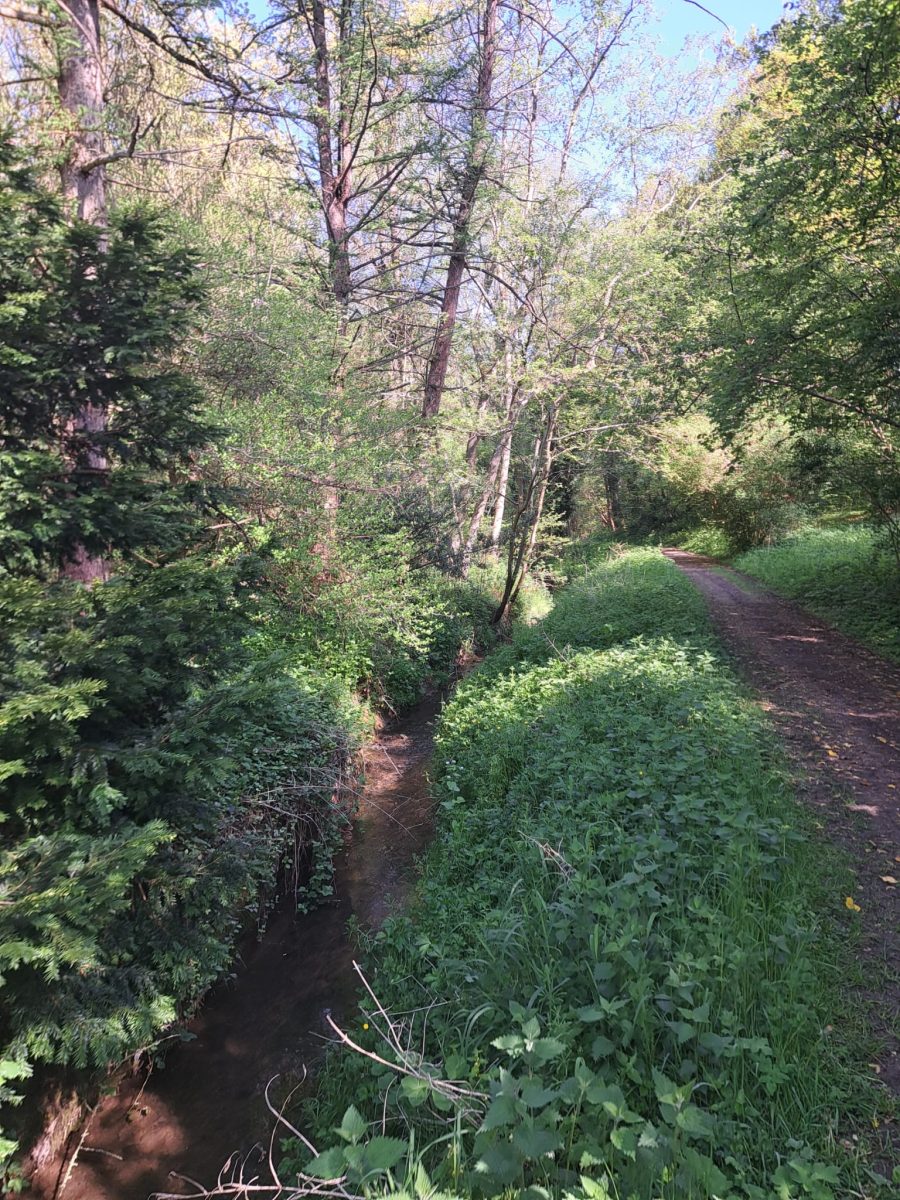 Nun durchstreifen wir ein bewaldetes Stück und folgen dem Verlauf eines kleinen Bachs, bis wir an die asphaltierte Straße Kaalheide kommen und dort nach links abbiegen. Am Punkt 321 nehmen wir rechts die Straße Lindaal und laufen, nun im Ortsteil Eizer, wieder ein Stück an Einfamilienhäusern vorbei, ehe es nach einer Rechtskurve wieder bergauf geht – natürlich auf Kopfsteinpflaster.