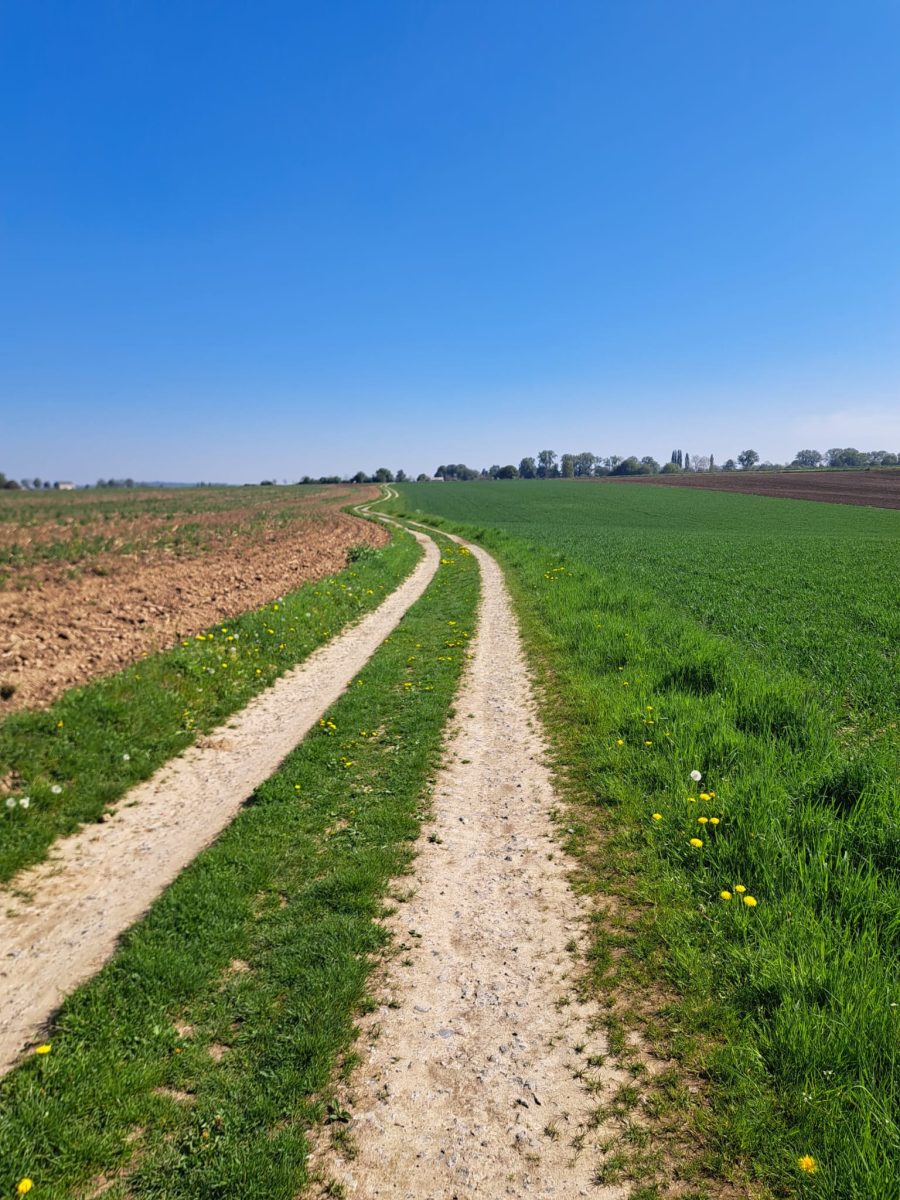 Auf der Höhe – kurz nach Überquerung der Gemeindegrenze zwischen Overijse und Huldenberg – öffnet sich die Landschaft mit reizvollen Blicken über das Plateau. Am Punkt 201 nehmen wir den Feldweg – Vanderkelenstraat – nach links. Er stößt nach einigen Minuten auf einen weiteren Feldweg. Während die Wegmarkierung nach links hin zum Punkt 202 weist, zweigen wir hier nach rechts ab und gehen in südlicher Richtung zwischen den Feldern weiter. An der nächsten Wegkreuzung biegen wir nach rechts auf einen weiteren Feldweg (Onze-Lieve-Vrouwweg) ab, der beiderseits von Sträuchern gesäumt ist und uns schließlich zum Punkt 200 bringen wird.