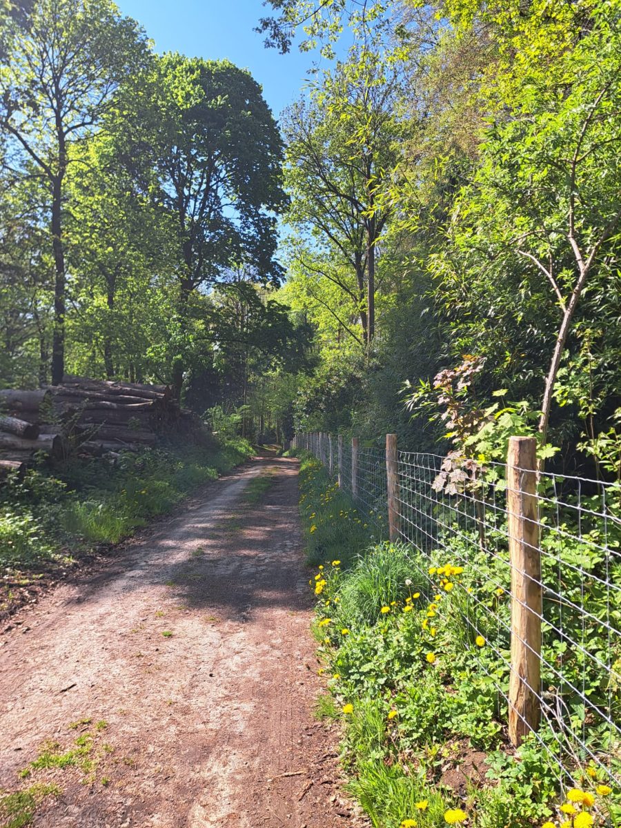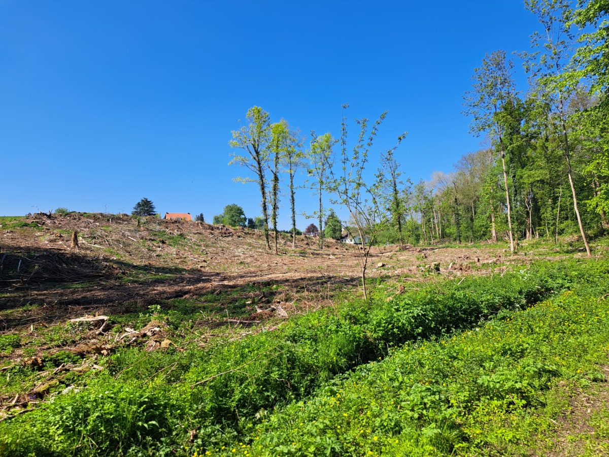 Einige hundert Meter lang trennt der Weg ein Waldgebiet (rechts) von Wiesen (links). Am Punkt 317 geht es dann nach rechts in den Wald hinein. Ehe wir die asphaltierte Belgiëlaan erreichen, sehen wir linkerhand ein frisch gerodetes Waldstück, das – nachhaltig – wieder aufgeforstet werden soll.