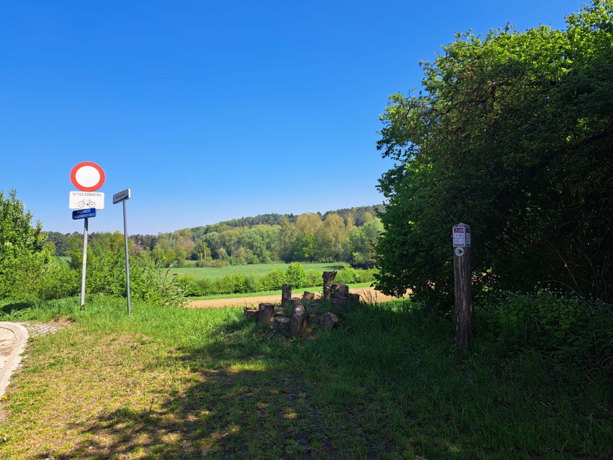 Am Punkt 327 schließt sich der Kreis unserer Wanderung. Wir biegen nach rechts auf die Nederlandlaan und anschließend die Luxemburglaan ein. Sie verlassen wir am Punkt 344 wieder nach rechts, um auf der Straße Korteveld – dieses Mal in südöstlicher Richtung weiter zu laufen. Wir gehen geradeaus und ignorieren den Wegweiser zum Punkt 344 an der Abzweigung zum Kleineveldweg. Die Straße Korteveld verläuft leicht bergab und mündet in die Kouterstraat, auf die wir nach links abzweigen. Nach wenigen Schritten geht es nach rechts in die steil bergab führende Ijskelderlaan.