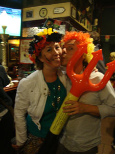 Ich entschließe mich, fünfzig Meter weiter in die irische Bar „Kitty o‘ Sears“ zu gehen, die gleich gegenüber dem Berlaymont-Gebäude, der Zentrale der EU-Kommission, liegt. Dort haben sich an die 50 Gäste eingefunden. Ich bestelle für 3,80 Euro an der Theke ein belgisches Abteibier. Der Barmann, der es mir reicht, hat seinen Kahlkopf mit drei Strichen, den belgischen Nationalfarben „schwarz-gelb-rot“ verziert. Ein anderer Barmann hat einen Hut mit Federn derselben Farben auf.