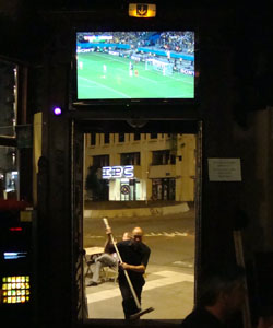 Während der Pause spreche ich mit einem verliebten Paar, das offensichtlich dafür ist, dass Belgien das Spiel gewinnt. Sie hat einen Kranz mit den belgischen Farben auf, er eine Perücke mit denselben. Ich frage die junge Dame, die irgendwie asiatisch wirkt, woher sie komme. „Dreimal darfst du raten. Wenn du es nicht errätst, zahlst du mir einen Drink“. Ich stimme zu und verliere. Sie kommt aus Lettland. Ihr Freund verrät mir, ohne dass ich wetten muss, dass er die italienische und die amerikanische Staatsbürgerschaft besäße. Interesse an dem Spiel bemerke ich an ihm nicht.