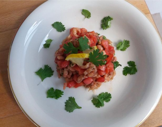 200 g fertig gepulte Nordseekrabben, 2 mittelgroße Tomaten, 10 ml Zitronensaft, 30 ml Sonnenblumen- oder Olivenöl, Salz, Pfeffer, 1 Handvoll gehackten Koriander.