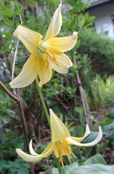 Eine besondere Knolle, die winterhart ist und seit Jahren in meinem Garten lebt, ist Erythronium ‘Pagoda’, ein Hundszahngewächs, das den schönen deutschen Namen Forellenlilie trägt, warum auch immer. Mit ihren gelben Blüten, die wirklich eine Pagodenform zeigen, nimmt sie die Farbe auf, die das Frühjahr dominiert.