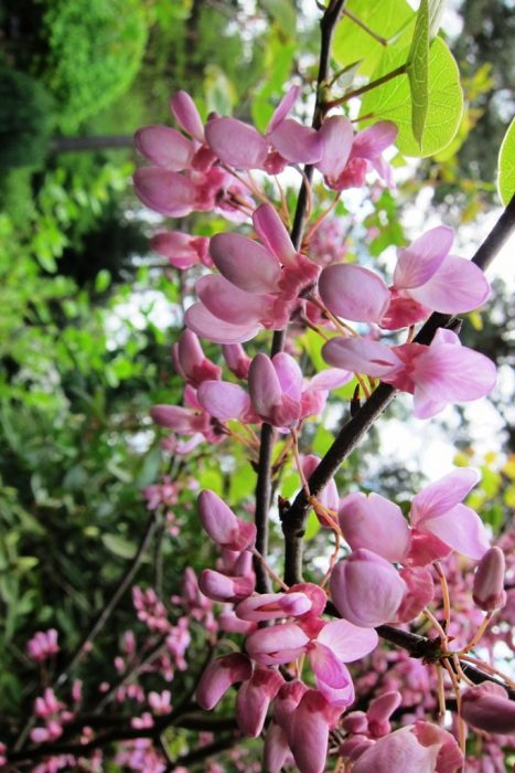 Die Blütenpracht der frühblühenden Gehölze wie Magnolien, Pfirsich- und Mandelbäumchen, aber auch der ersten Rhododendren und Azaleen ist allen bekannt. Doch auch einige erstaunlich winterharte Exoten, beteiligen sich an diesem Spiel: Der aus dem Mittelmeerraum stammende Judasbaum (Cercis) zeigt, seine lilafarbenen Lippenblüten am kahlen Holz. Weiß blüht die immer beliebtere Orangenblüte (Choisya ternata), während Tachyurus chinensis, treffenderweise Perlschweif genannt, das Gelb wieder aufnimmt. Zierlich hängen die Zweige der Exochorda x macrantha über, die mit ihren kugeligen weißen Knospen reiche Blüte versprechen.