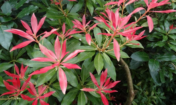 Oft sind es nicht die Blüten, die in dieser Jahreszeit Farbe ins Geschehen bringen, junges Blatt ist oft ebenfalls eine Augenweide. Während die Pracht der meisten Pierissorten schon verblasst, beleuchtet die Sorte „Forest Flame“ im April den Schattengarten mit seinem rotem Austrieb, an ähnlicher Stelle, etwas subtiler, zeigen die kleinen Ahornsorten alle Farben von rötlichgrün über gelb und ganz zartem Grün. Eine Besonderheit ist die auffällige Blühweise von Acer aconitifolium, im Gegensatz zu jener seiner eher bescheidenen Artgenossen.
