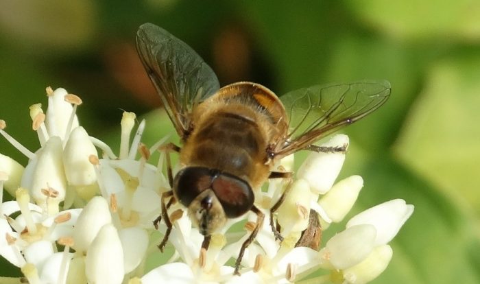 Leider beraubt der ordentliche Gärtner damit die Vögel um eine wichtige Nahrungsquelle, wenn er die Beeren des Kirschlorbeers, der Zwergmispel und der Weiß- und Rotdorne entfernt. Obendrein entdeckte ich erst kürzlich im Vorgarten an einem etwas wild wachsenden Cornus alba eine Überraschung. Diesen Strauch pflanzt man ausschließlich wegen der auffälligen Farbe seiner regelmäßig getrimmten Triebe. Hier aber hatten sich, weil unbeschnitten, späte Blüten geöffnet. Und siehe da, mehrere Honig- und Wildbienen und vielen anderen Insekten, u.a. eine große Ameise, labten sich im Sonnenschein. Wieder etwas dazugelernt!