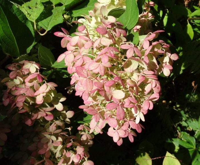 Doch weg vom Unauffälligen, hin zu den Prachtstücken, Dahlien aller Farben leuchten im Obst- und Kräutergarten. Im Hintergrund der Beete beugen sich schwer die Blüten der hier „Schapskoppen“ also Schafsköpfe genannten Rispenhortensie. Obwohl sie bei Regen Bodenneigung zeigt, ist die Varietät Vanille Fraise, die ihrem Namen alle Ehre macht, ein wahrer Schatz. Sie gehört zur Gruppe der Hortensien, die man stark zurückschneiden und dennoch Blütenpracht erwarten darf. Doch auch für die Bauernhortensien, deren Schnitt oft Schwierigkeiten verursacht, kann man jetzt schon etwas tun. An vielen Sträuchern sind die Blüten in diesem Jahr unschön verblüht. An geschützten Orten kann man die Stängel bis zum nächsten Knospenpaar zurückschneiden. Auch verjüngen ist jetzt angesagt. Die ältesten Austriebe nimmt man beinahe bodentief weg, so haben neue Triebe Luft und Platz.