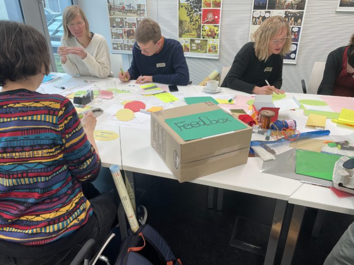 Die Deutschlehrer*innen ließen in Themengruppen ihrer Kreativität dann auch sehr gerne freien Lauf und stellten sich voll auf die neue Methodik ein. Sie interviewten andere Teilnehmer*innen, erstellten MindMaps und bastelten ihre innovativen, bunten, ausgefallenen Prototypen, wie eine “Motivationsrampe” als Metapher für den Aufstieg bis zum Ziel des Deutschunterrichts: „Pret-à–parler“ oder eine “Feedbox” mit Instrumenten wie Zeitmanagement und sprachliche Analyse, um ein Projekt nachhaltig gut zu gestalten. Es herrschte gute Stimmung, die bis zum Anbringen eines goldenen Auspuffs an die Box, der Prüfungen und Klausuren korrigieren kann, führte.