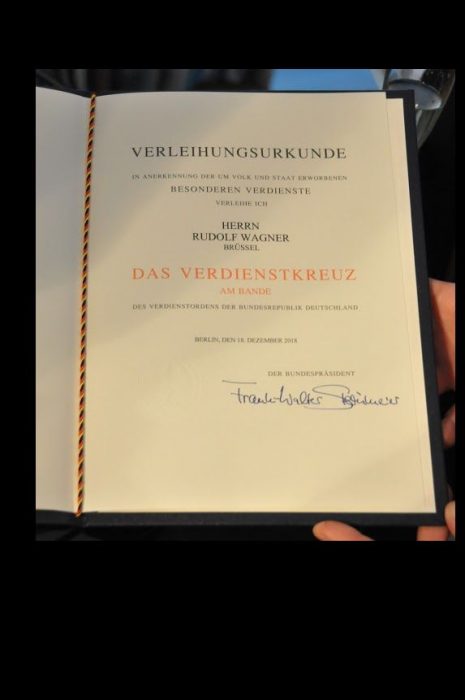 „Rudolf Wagner war und ist ein Brückenbauer“ sagte Botschafter Kotthaus und beglückwünschte ihn im Namen des Bundespräsidenten, bevor er dem Geehrten das Bundesverdienstkreuz am Jackettrevers anheftete. Die Anwesenden applaudierten herzlich und hoben ihre Gläser auf das Wohl des frischen Ordensträgers. In seiner Erwiderung dankte Wagner für die „Auszeichnung, die mich stolz macht und von der ich allen Mitarbeitern und Freunden von Belgieninfo.net ein Zipfelchen oder Eckchen abgeben möchte“.