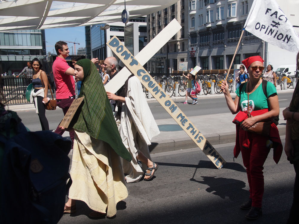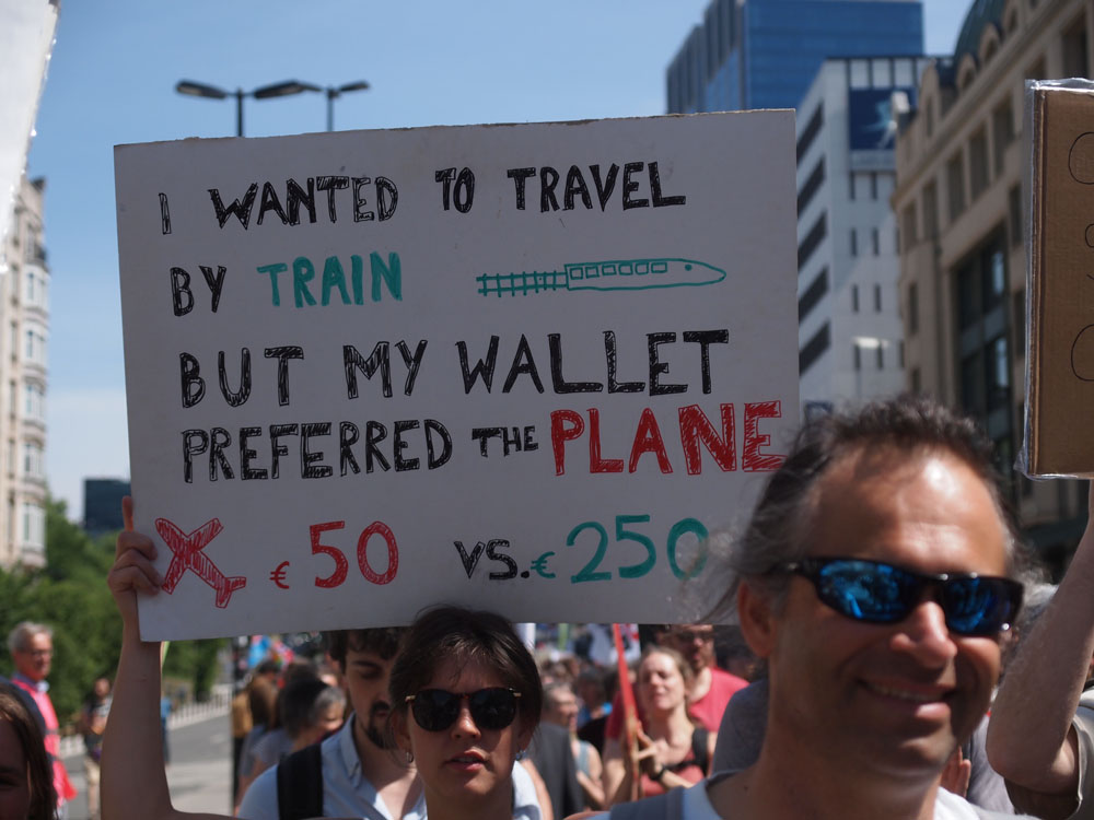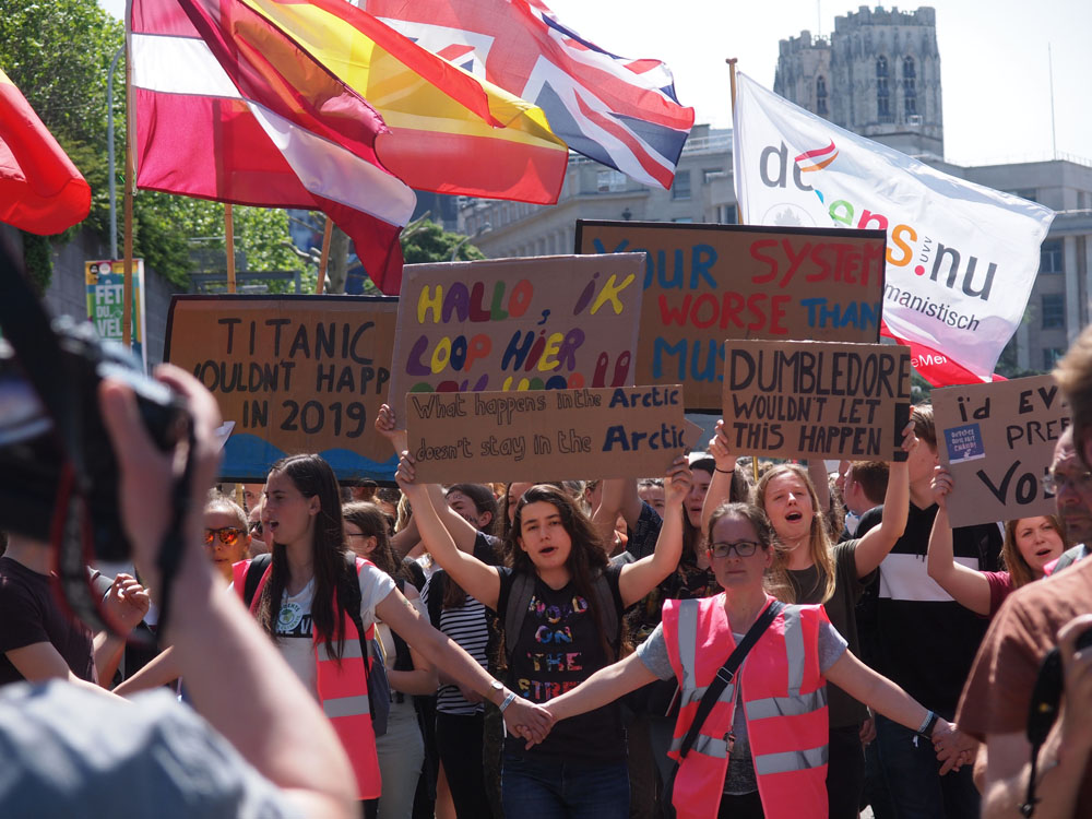 Im Blick auf die belgischen Wahlen und die EU-Wahl am 26. Mai forderten etliche Transparente dazu auf, die Wahlen zu einer Klima-Wahl zu machen. Immer wieder wurde betont, dass der Fortschritt des Klimawandels sofortiges Handeln erfordere. Stärker als bei früheren Demos kam diesmal die soziale Seite einer verschärften Klima-Politik zur Geltung. So hieß es auf einem Transparent „I wanted to travel by train – but my wallet preferred the plane: 50 vs. 250“.