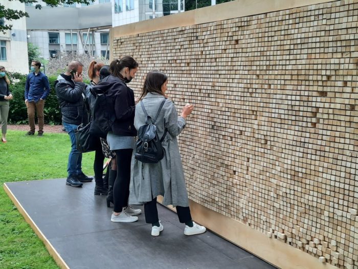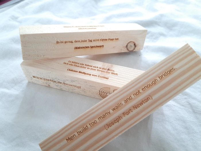 Das gemeinsam vom Goethe-Institut und dem Europäischen Parlament organisierte und durch die deutsche Botschaft beim Königreich Belgien unterstützte Kunstprojekt kehrt damit zum dritten Mal nach Belgien zurück, nachdem es im Jahr 2020 bereits in Brüssel und Antwerpen zu Gast war und anschließend auf Europatour in neun weiteren europäischen Staaten ging. Das Kunstprojekt basiert auf Zitaten, die in vier Sprachen auf ca. 6000 Holzklötzen eingraviert wurden und die Anfang 2020 in vom Goethe-Institut initiierten europaweiten lokalen Wettbewerben gesammelt wurden. Die Besucher interagieren dabei in doppelter Weise: Sie betrachten das Kunstwerk und lesen die Zitate, um sich dann ein oder zwei der Holzklötze mitzunehmen und die Wand damit langsam „verschwinden“ zu lassen. Sie ist im Bürgergarten der Europäischen Parlaments frei zugänglich. Auf den Holzklötzen finden sich neben Gedanken von Goethe, Hannah Arendt, Camus oder Vaclav Havel auch Filmzitate, Sprichworte oder Popkulturelles. Ein sehr aktuelles Zitat der bekannten belgischen Schriftstellerin Rachida Lamrabet ist auch zu finden: „Ich hoffe sehr, dass wir aus dieser Krise als denkende Wesen erwachen“.